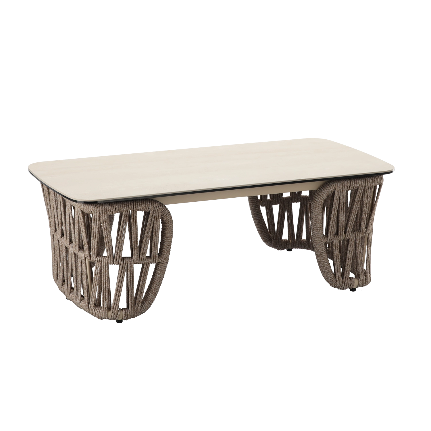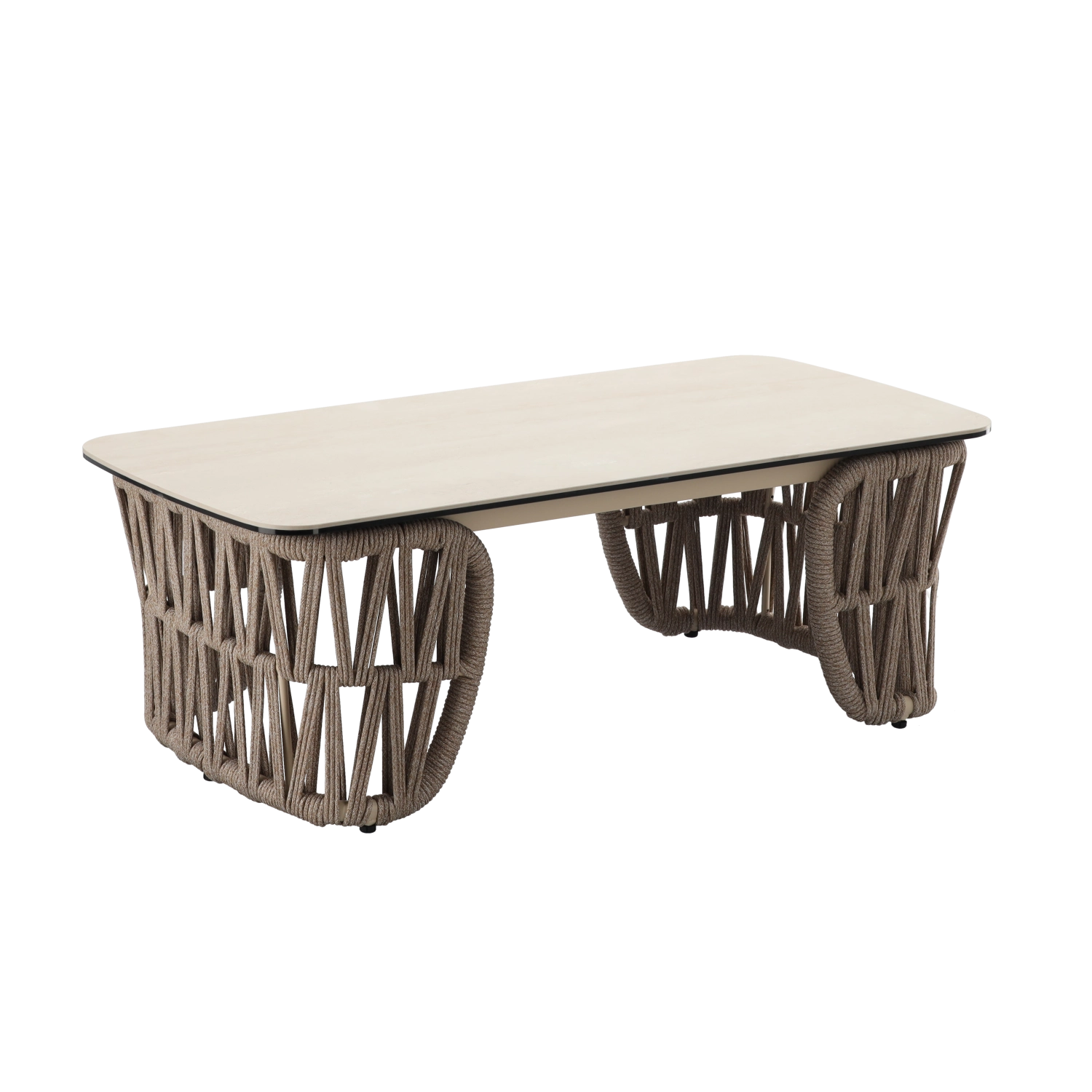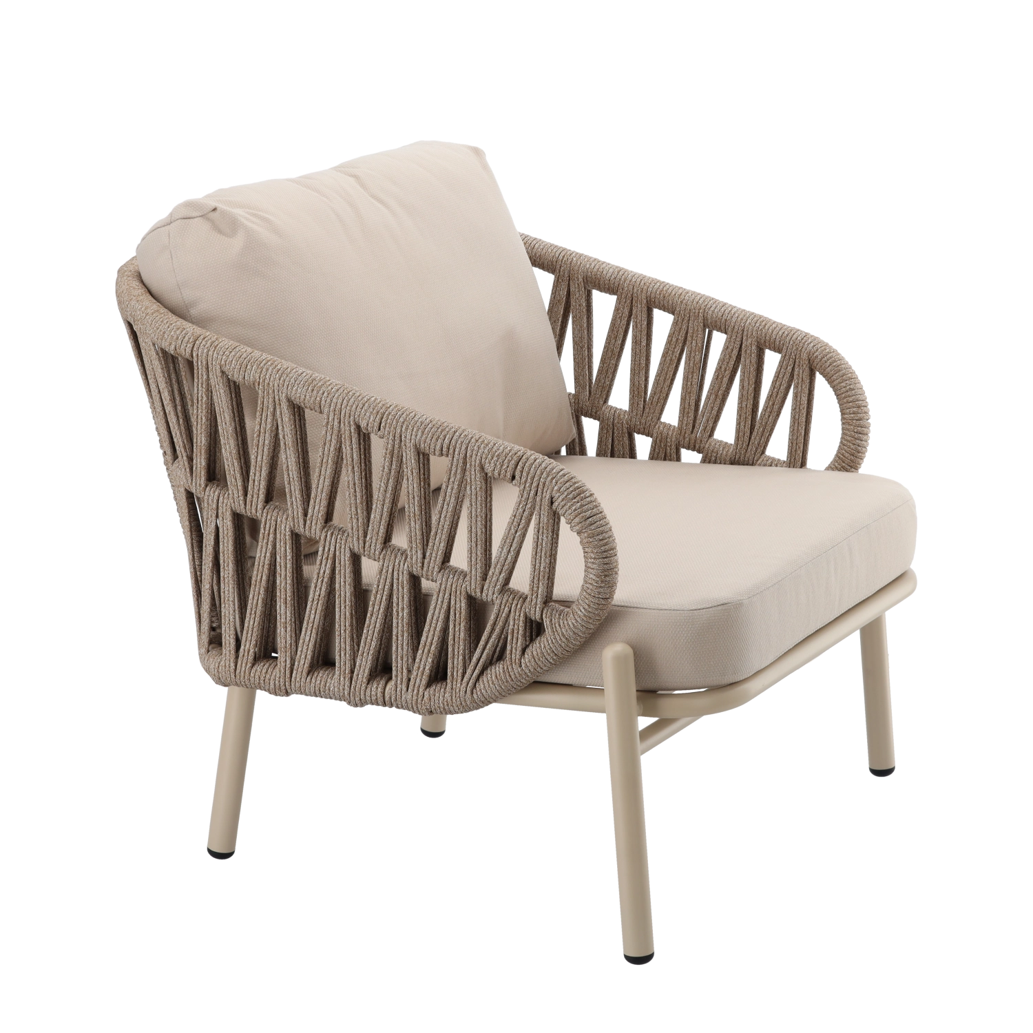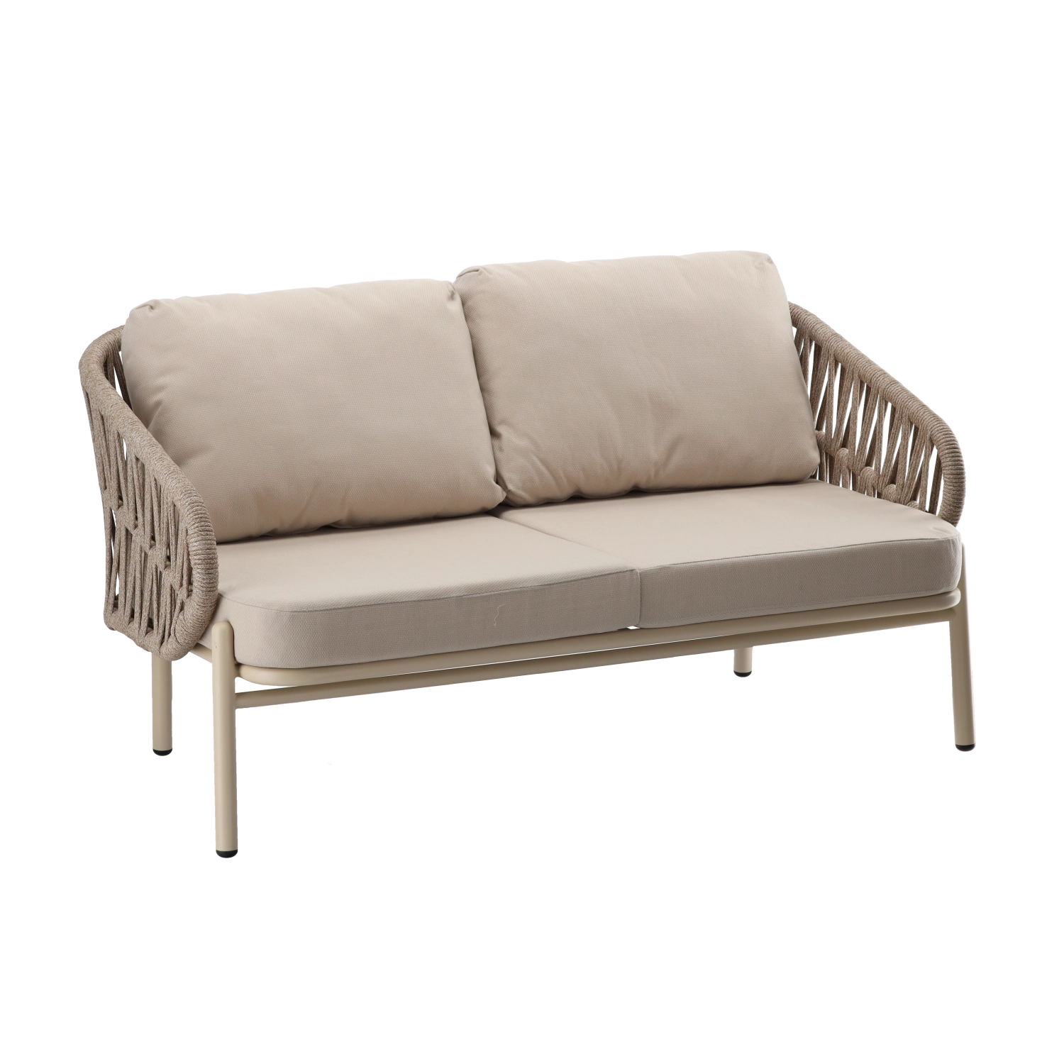 De set bevat een tweezitsbank, 2 comfortabele fauteuils en een ruime salontafel. De lichte maar stevige aluminiumconstructie met poedercoating is weer- en corrosiebestendig, waardoor de set seizoen na seizoen meegaat. De neutrale beige kleur en de gevlochten zijpanelen geven het geheel een tijdloze elegantie.