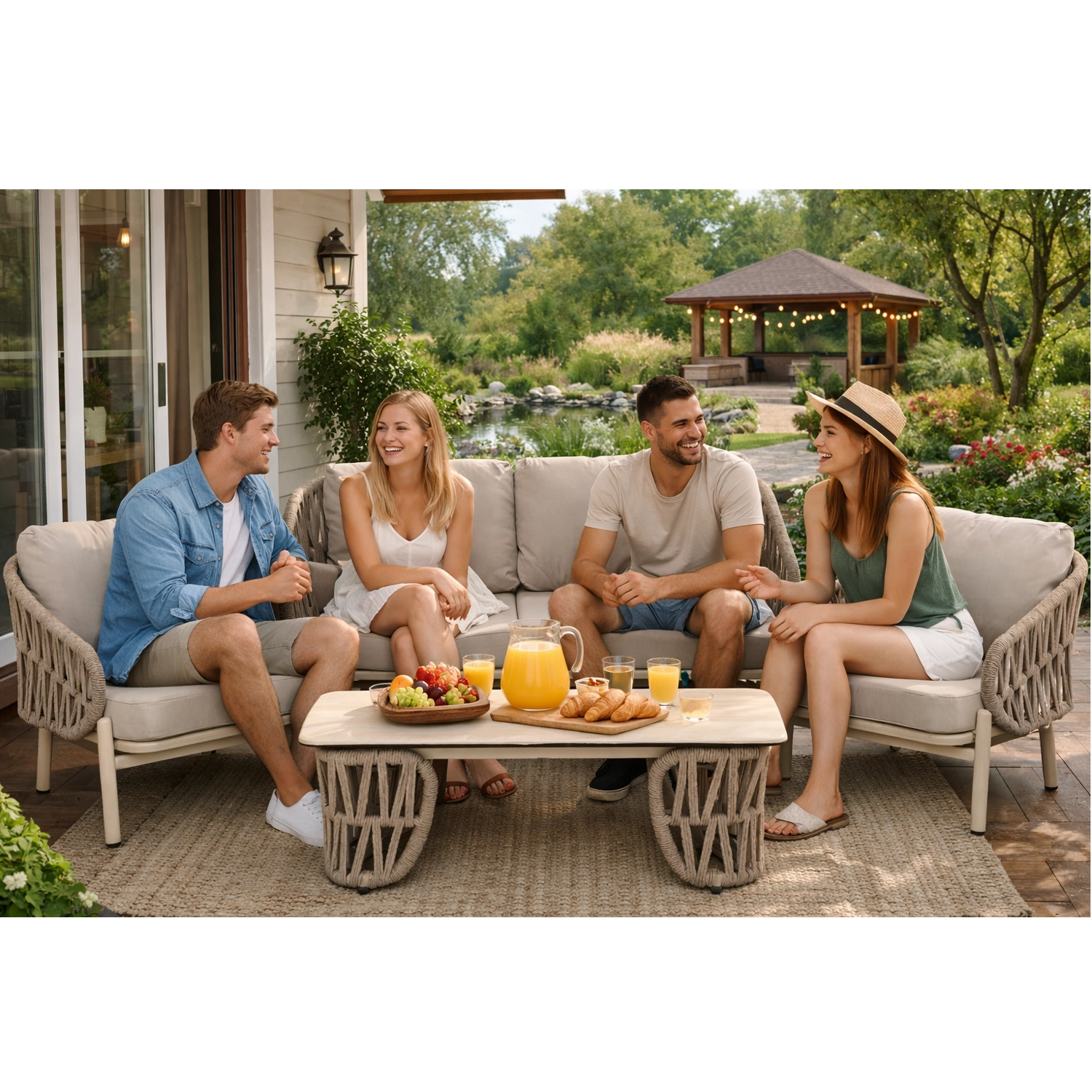 De dikke 10 cm kussens van Olefin-stof met duurzame vulling bieden uitzonderlijk comfort voor momenten met familie en vrienden. De stabiele tafel met decoratief, luchtig onderstel en een resistent blad biedt voldoende ruimte voor koffie en hapjes.