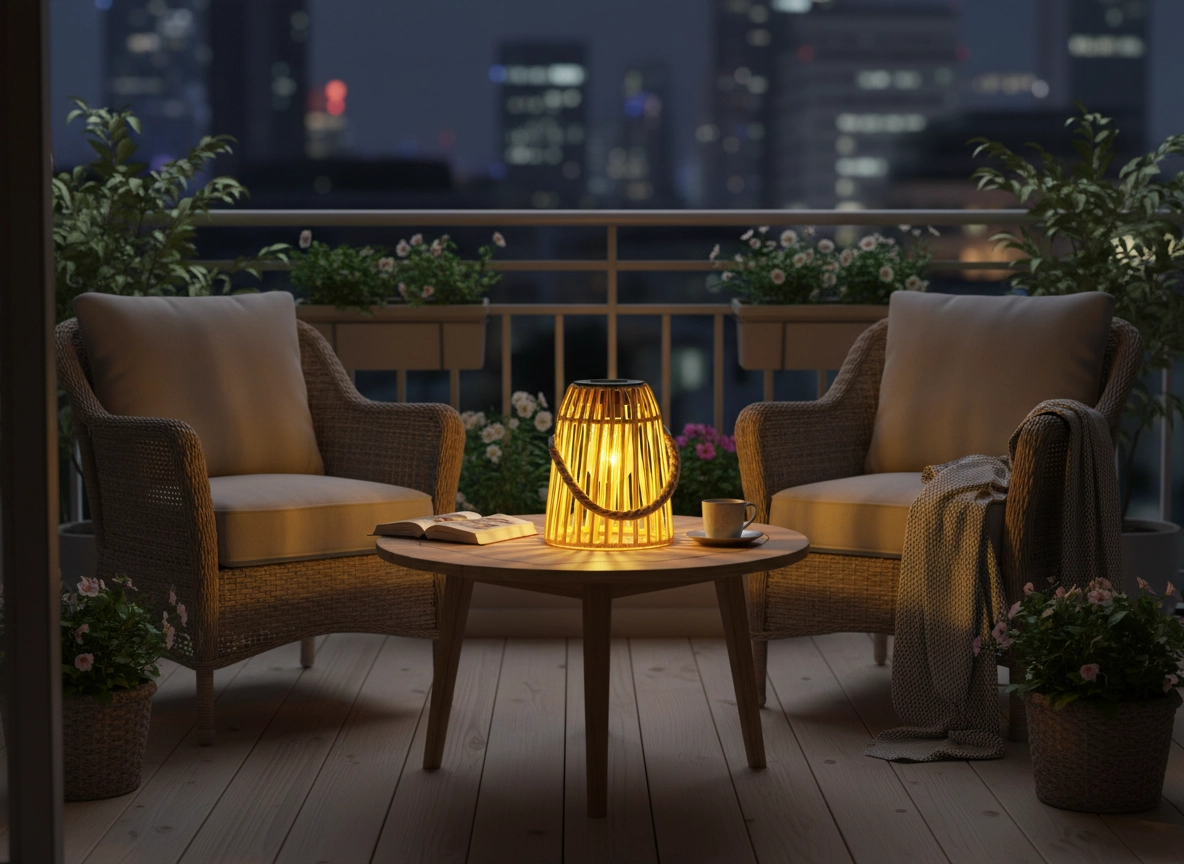 Het warme gele licht creëert een knusse setting voor avonden op balkon, terras of in de tuin – ideaal om te ontspannen met een boek of een drankje.