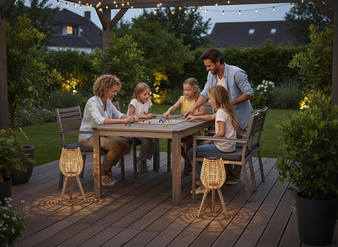 Dankzij de draadloze werking plaatst u hem eenvoudig overal – op een houten terras, langs een tuinpad of op het balkon. De gevlochten rotanlook geeft de ruimte een moderne boho-touch en de houten poten zorgen voor stabiliteit en een elegante accentlijn.