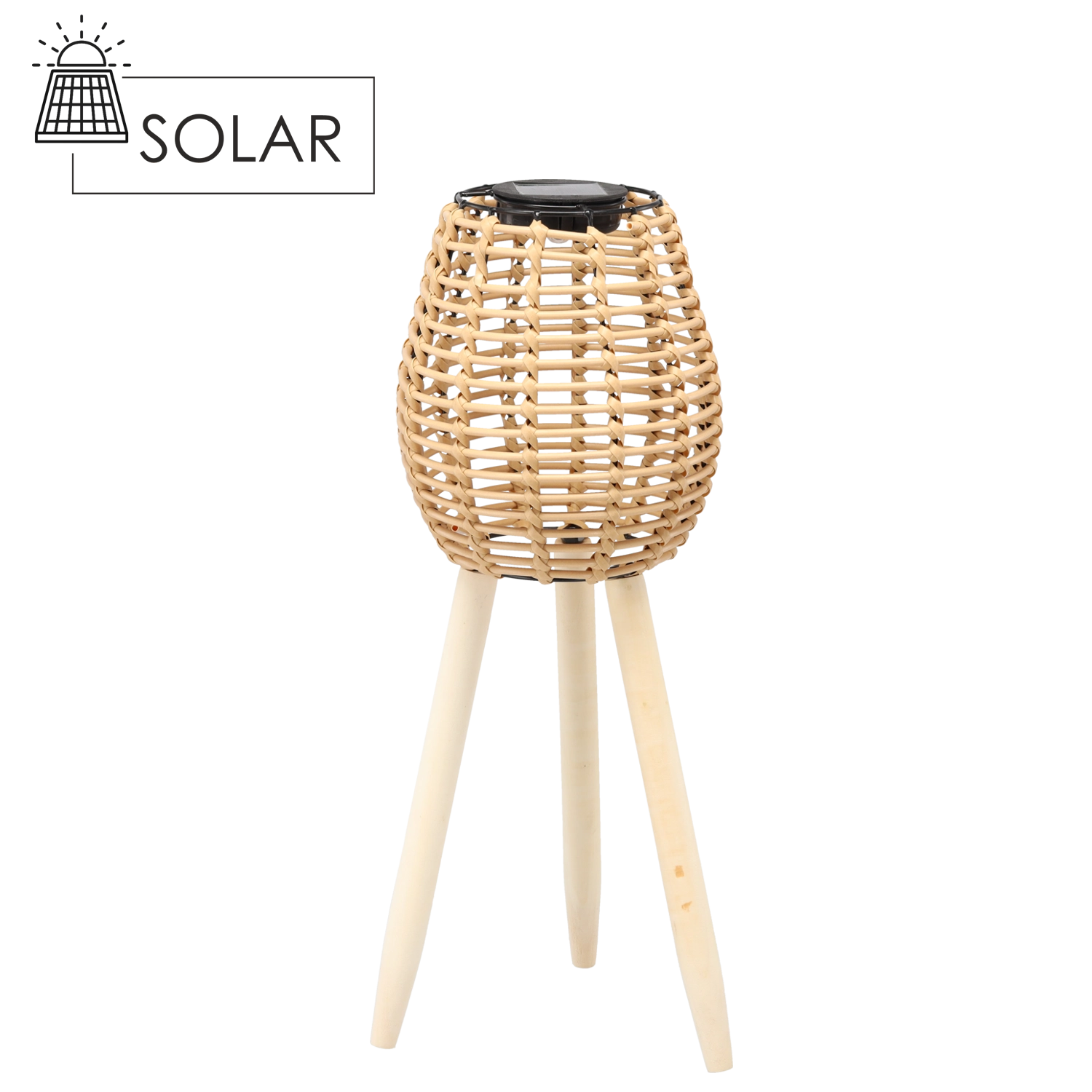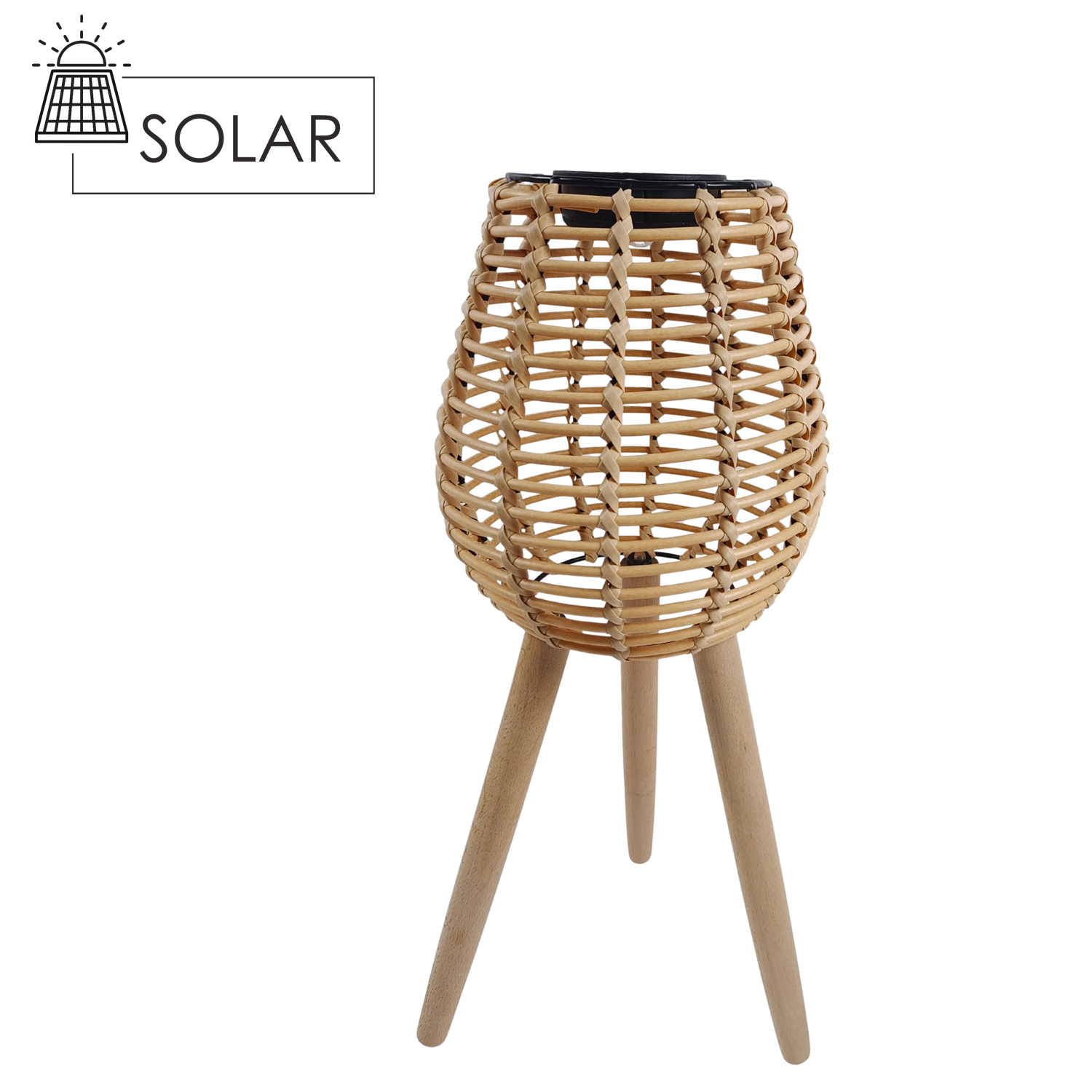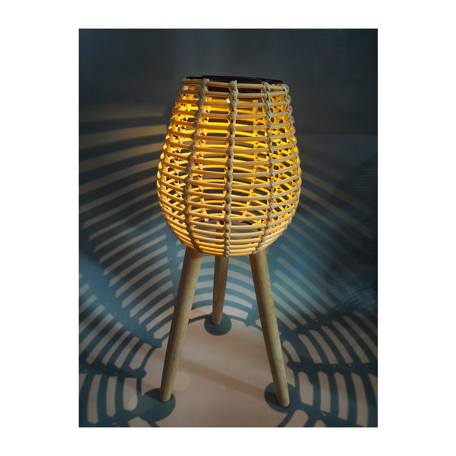 De zonne-energie lantaarn met een hoogte van 52 cm valt op door de natuurlijke esthetiek en stabiele driepootconstructie. Het polykristallijne zonnepaneel laadt overdag de accu op en na zonsondergang licht de energiezuinige LED op, die zacht, decoratief licht creëert voor ontspanning of samen zitten met vrienden.