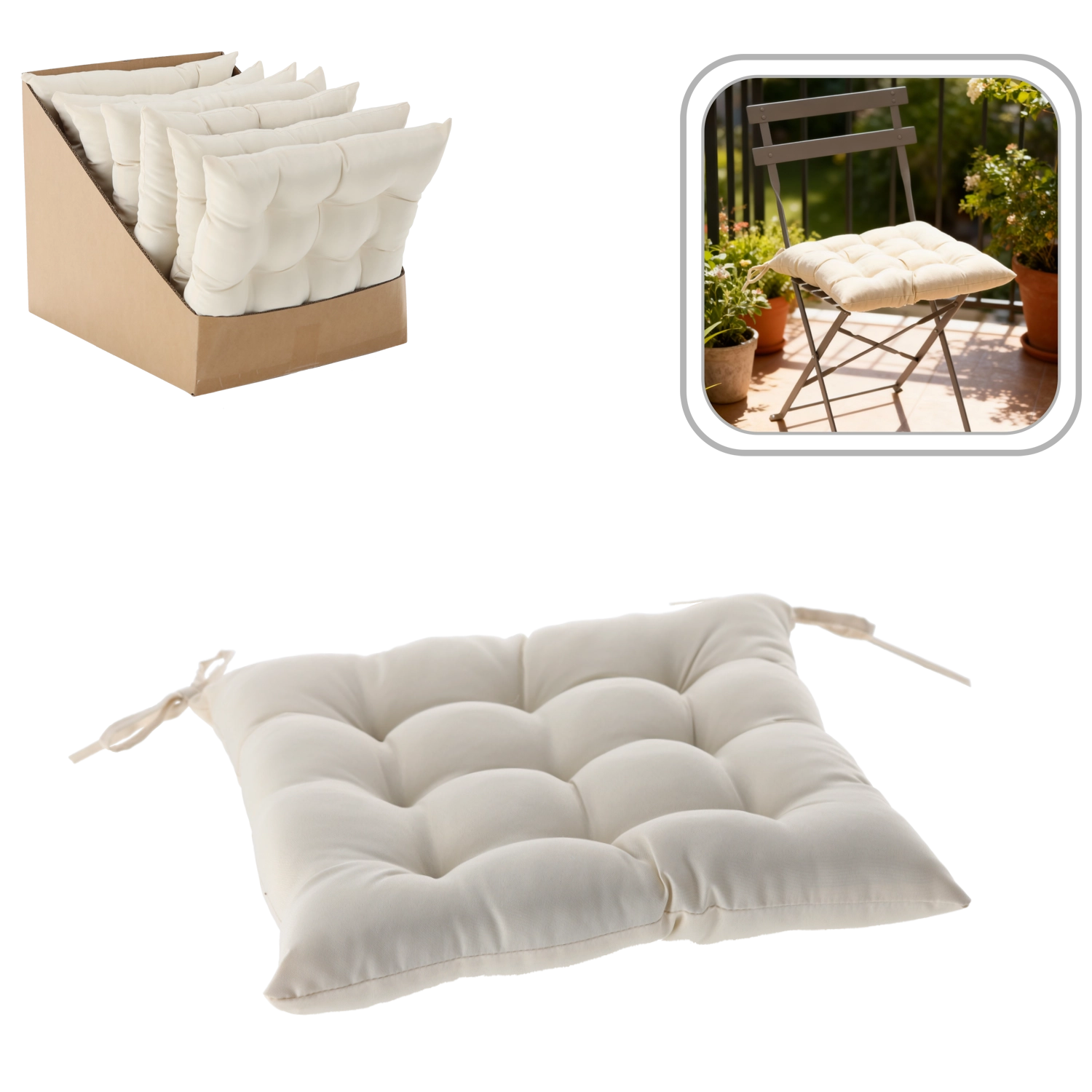 Praktische bindlinten zorgen ervoor dat het kussen stevig op zijn plek blijft, ook bij dagelijks gebruik. De slijtvaste polyester hoes is onderhoudsvriendelijk en geschikt voor regulier gebruik binnens- en buitenshuis.