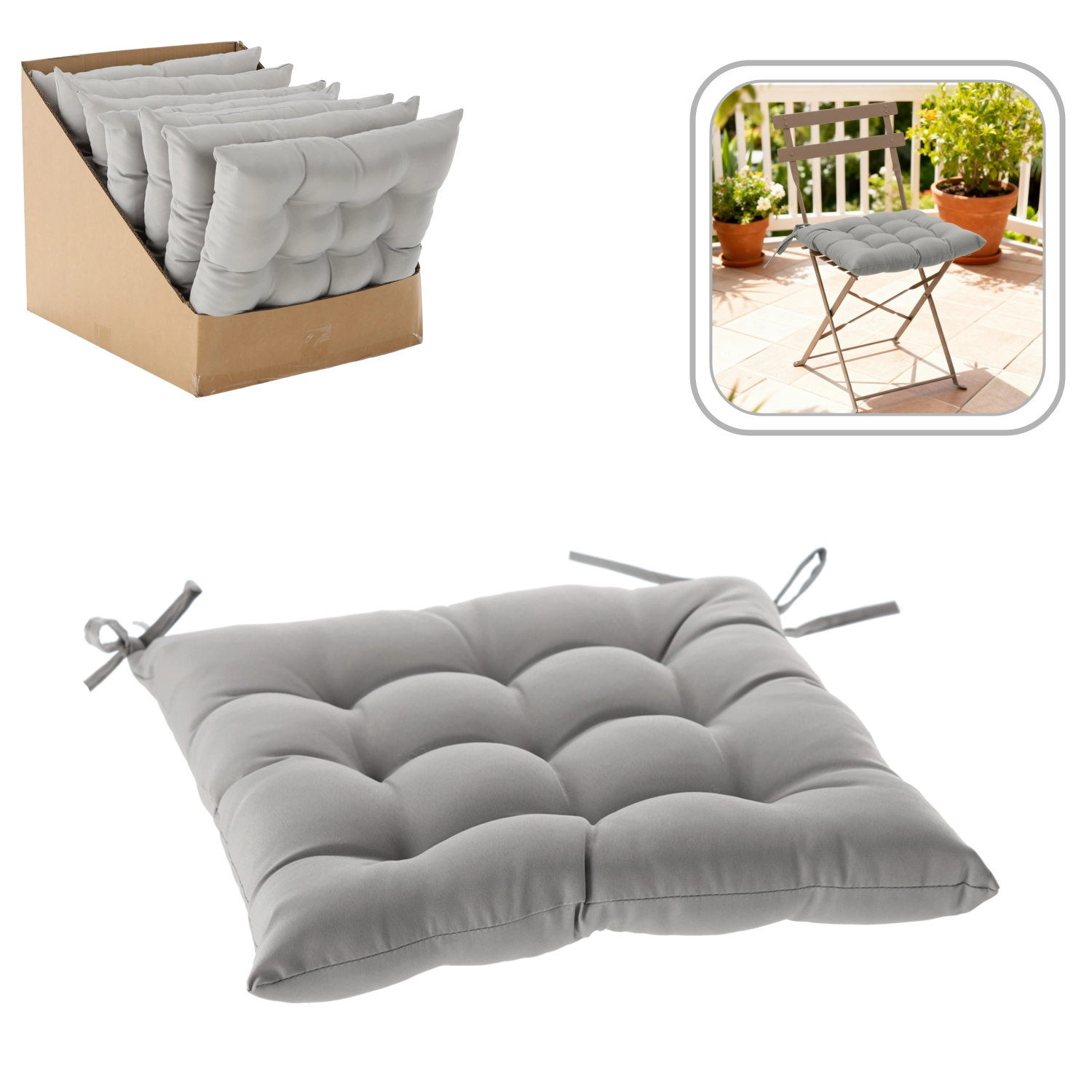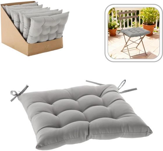 Geniet van comfortabel zitten, binnen én buiten, met dit lichtgrijze stoelkussen van 40 × 40 × 6 cm. Dankzij 9 stikpunten behoudt het uitstekend zijn vorm, de zachte vulling verhoogt het comfort en de praktische koordjes zorgen voor een betrouwbare bevestiging aan de stoel. Het duurzame oppervlak is makkelijk te onderhouden en de elegante kleur past in ieder interieur, op het balkon of op het terras.