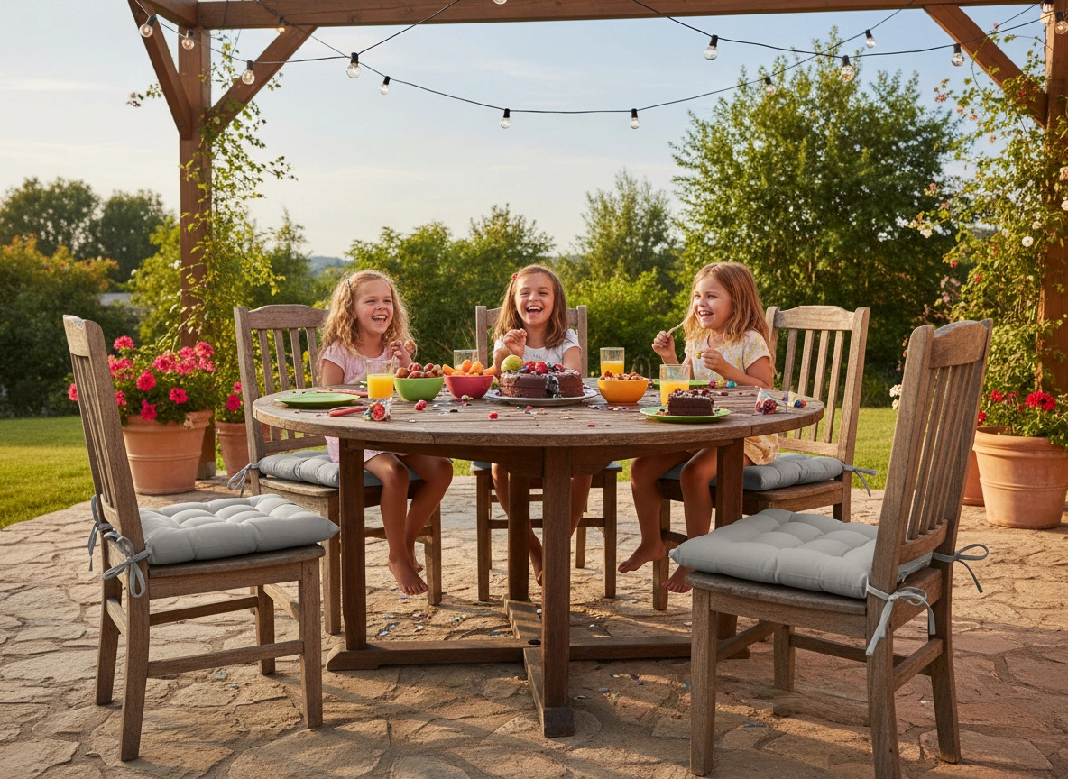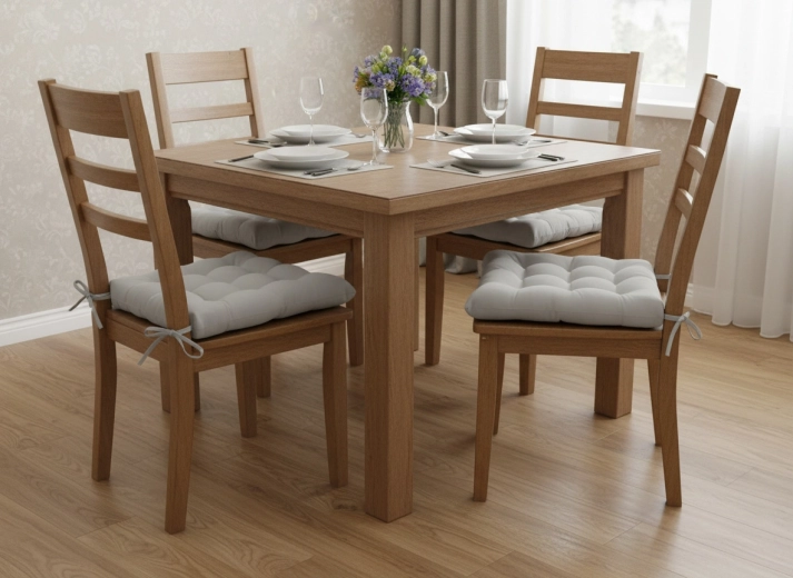 De hoes van 100% polyester is eenvoudig te reinigen en bestand tegen alledaagse vervuiling. Twee bevestigingskoordjes houden het kussen stevig op zijn plaats, zodat het niet verschuift en precies blijft liggen waar het hoort – ideaal voor eetkamer, keuken, werkkamer en overdekte buitenruimtes.