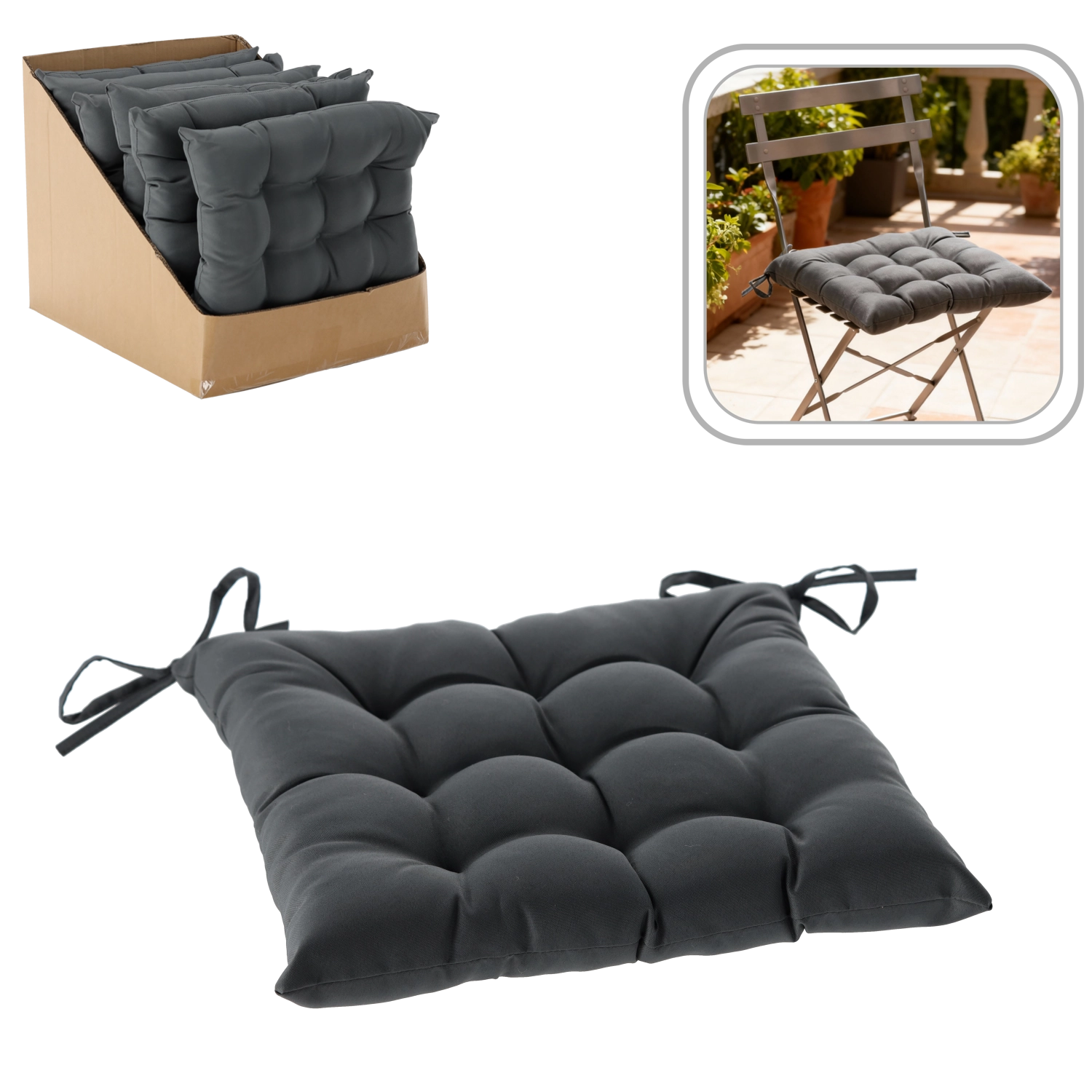 Verfraai eetkamer, keuken en terras met een praktisch stoelkussen dat elegante uitstraling combineert met dagelijks comfort. De donkergrijze tint is makkelijk te combineren met de meeste meubels en vereist weinig onderhoud. Het 9-punts stiksel zorgt voor een stabiele verdeling van de vulling en een langere levensduur.