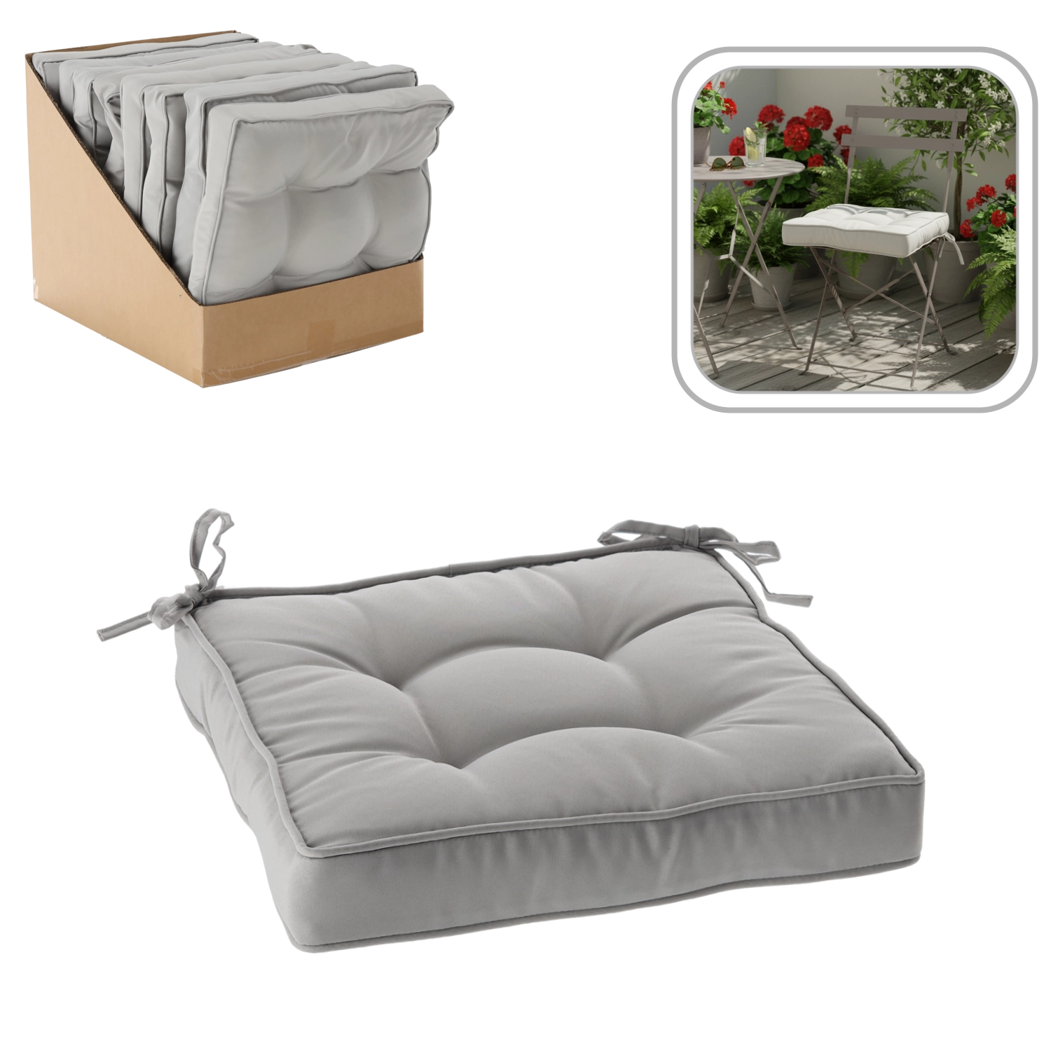 Dankzij de twee koordjes bind je het kussen eenvoudig en stevig aan het frame van de stoel, zodat het niet wegglijdt en altijd op zijn plek blijft. De duurzame polyester hoes (160 g/m²) en de zachte vezel binnenin bieden prettige ondersteuning en extra comfort, ook bij langer zitten.