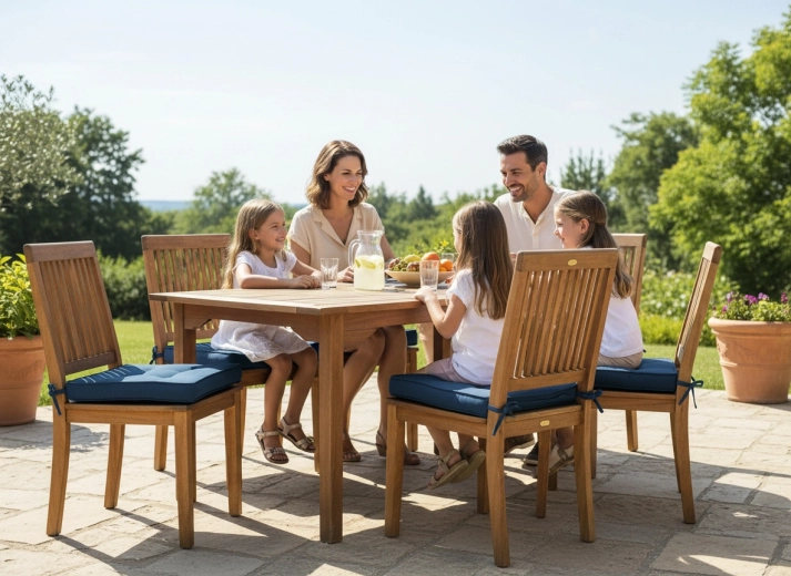 De duurzame polyester hoes en de tijdloze blauwe kleur passen in de eetkamer, keuken en bij de zitplaats in de tuin.