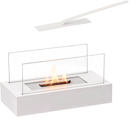 De witte basis en heldere glazen windschermen benadrukken de moderne look. De haard komt prachtig tot zijn recht op een salontafel, dressoir of plank.