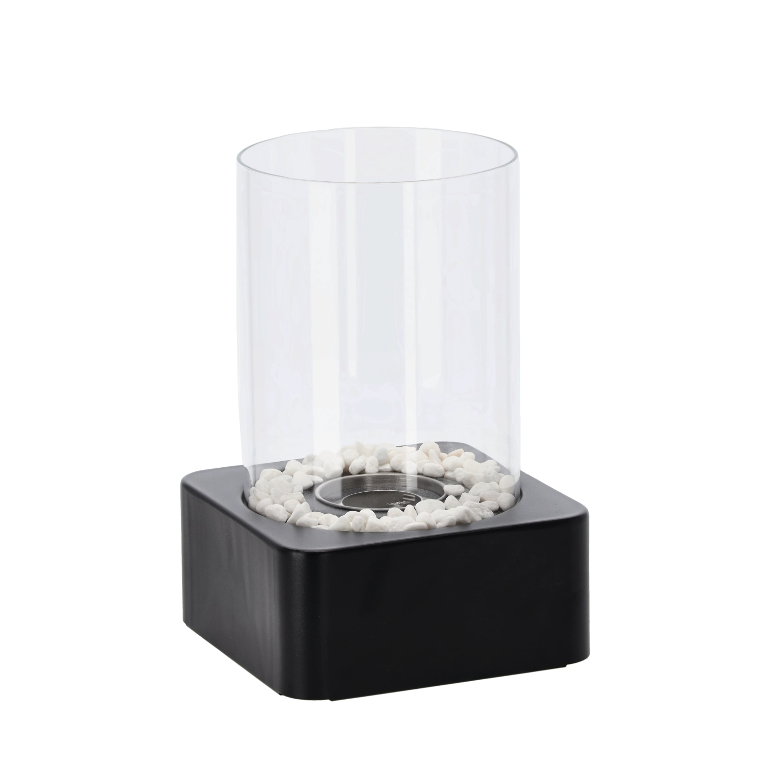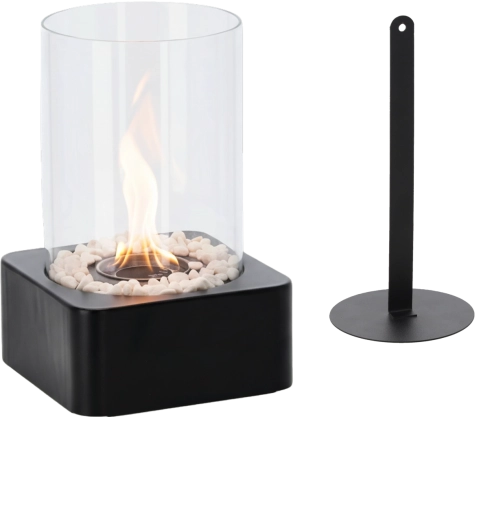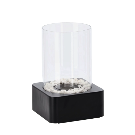 De tafel-biohaard is een stijlvol accessoire dat een moderne look combineert met het natuurlijke licht van een vlam. De matzwarte basis met decoratieve steentjes en het cilindrische glas vormen een veilig windscherm en garanderen stabiele verbranding voor een knusse sfeer zonder ingewikkelde installatie.