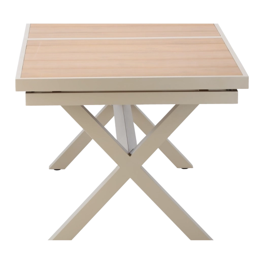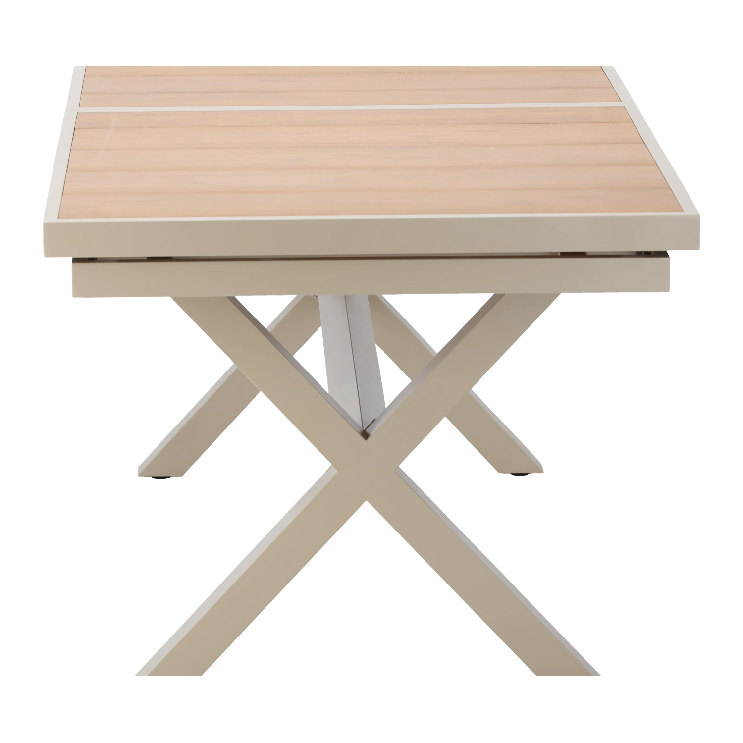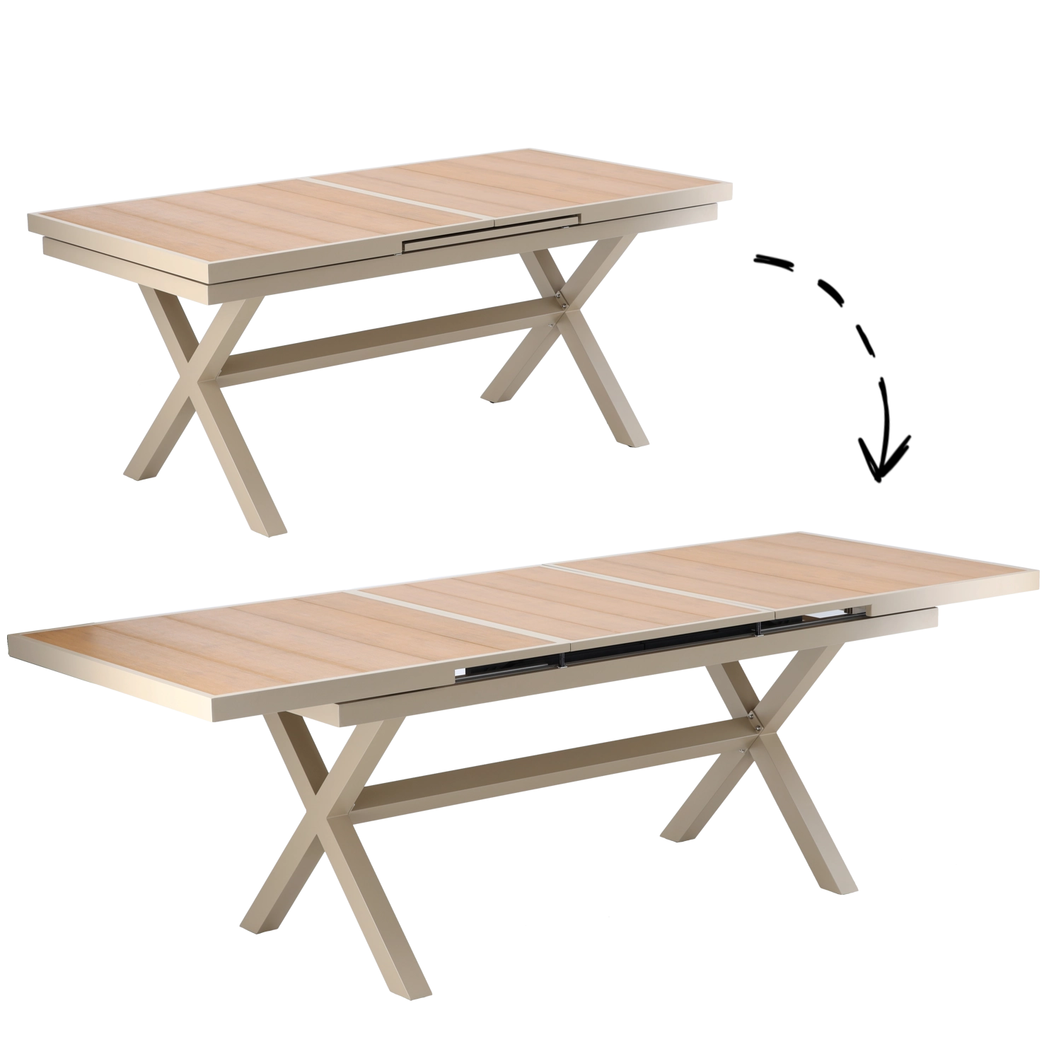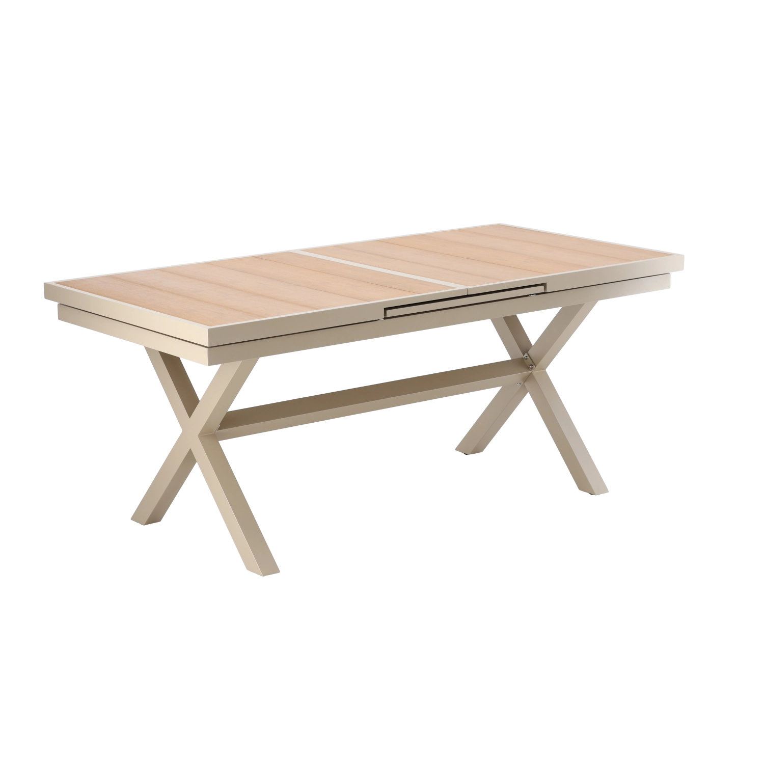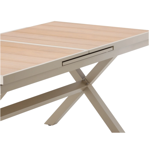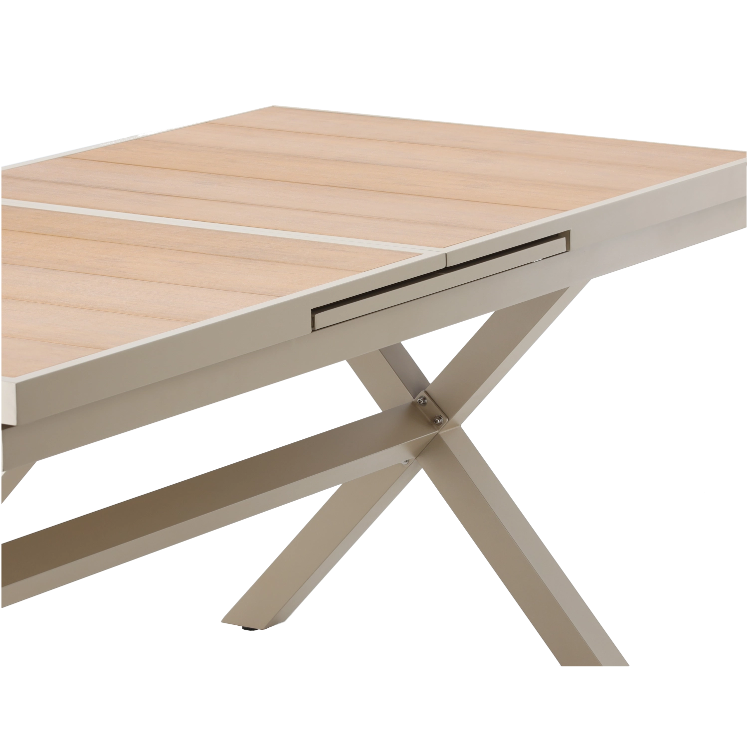 Geniet van comfortabel buiten tafelen dankzij het stevige kruisvormige onderstel en de stabiele constructie met poeder gecoate afwerking. De tafel past u moeiteloos aan uw actuele behoeften aan – van het dagelijkse diner tot grotere bijeenkomsten met familie en vrienden. Dankzij de neutrale beige kleur laat hij zich perfect combineren met diverse tuinsets.