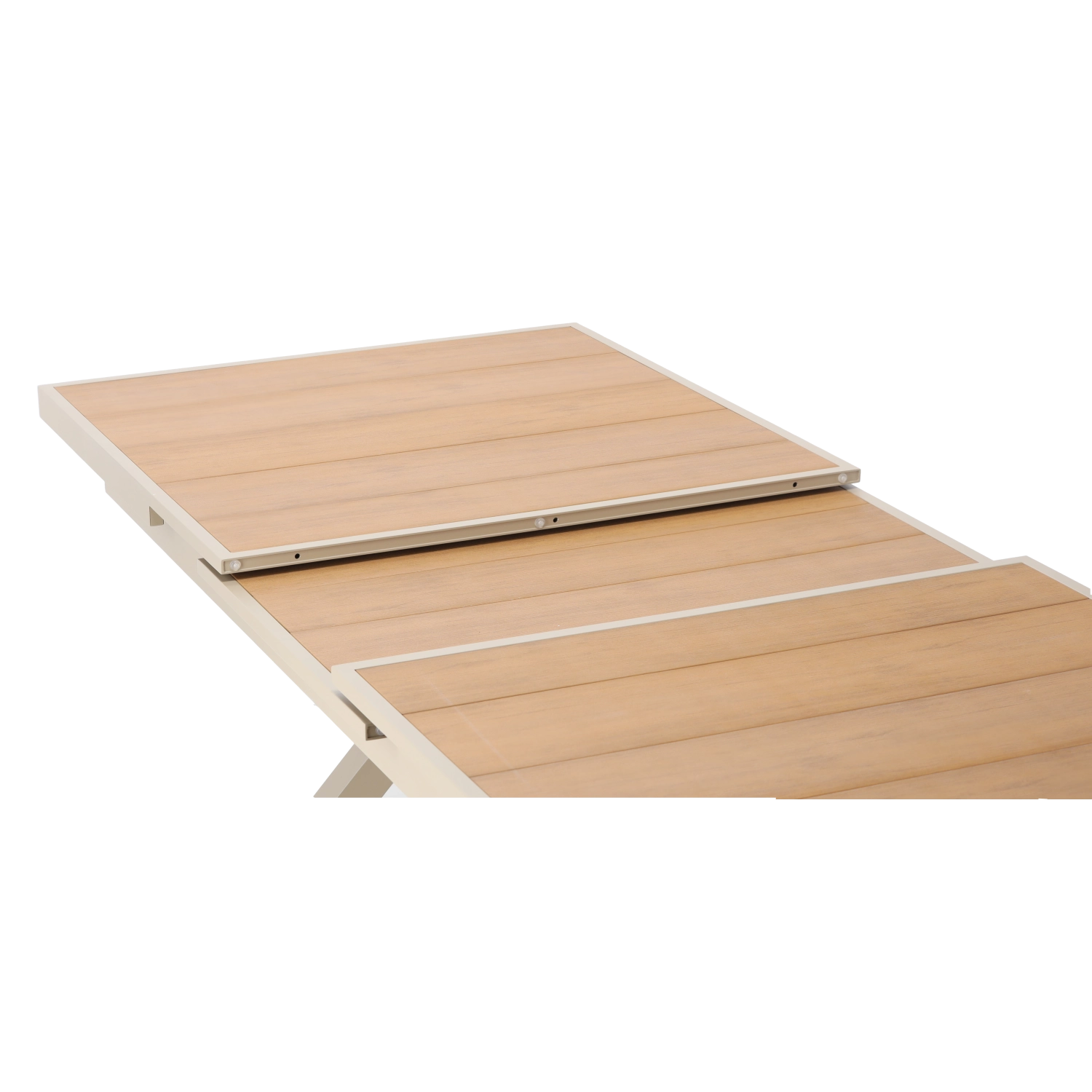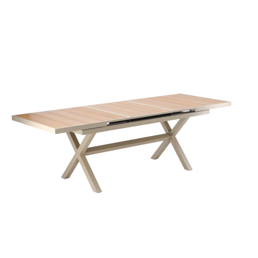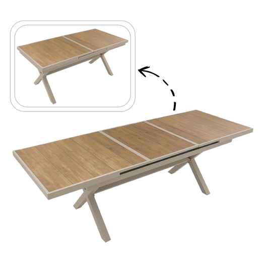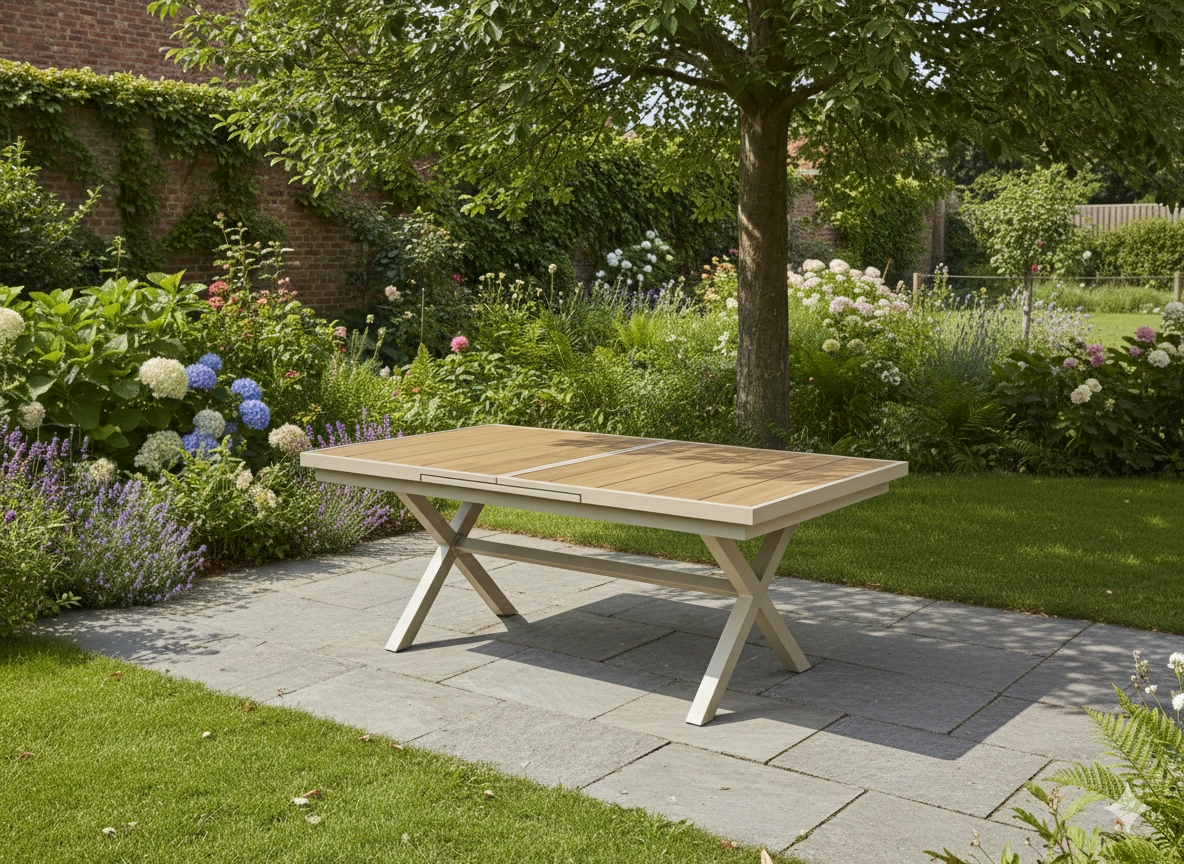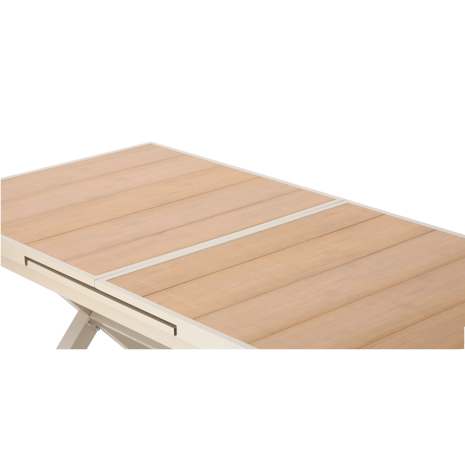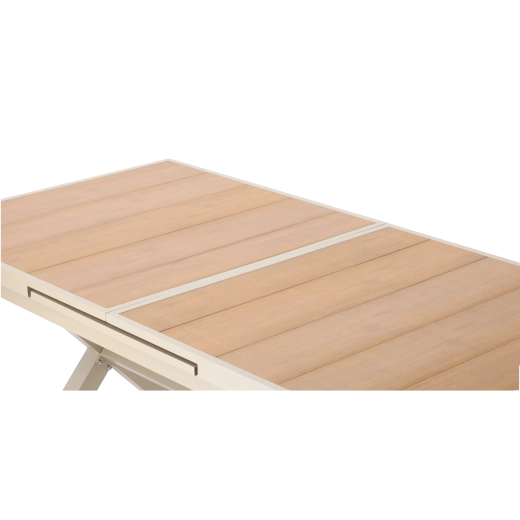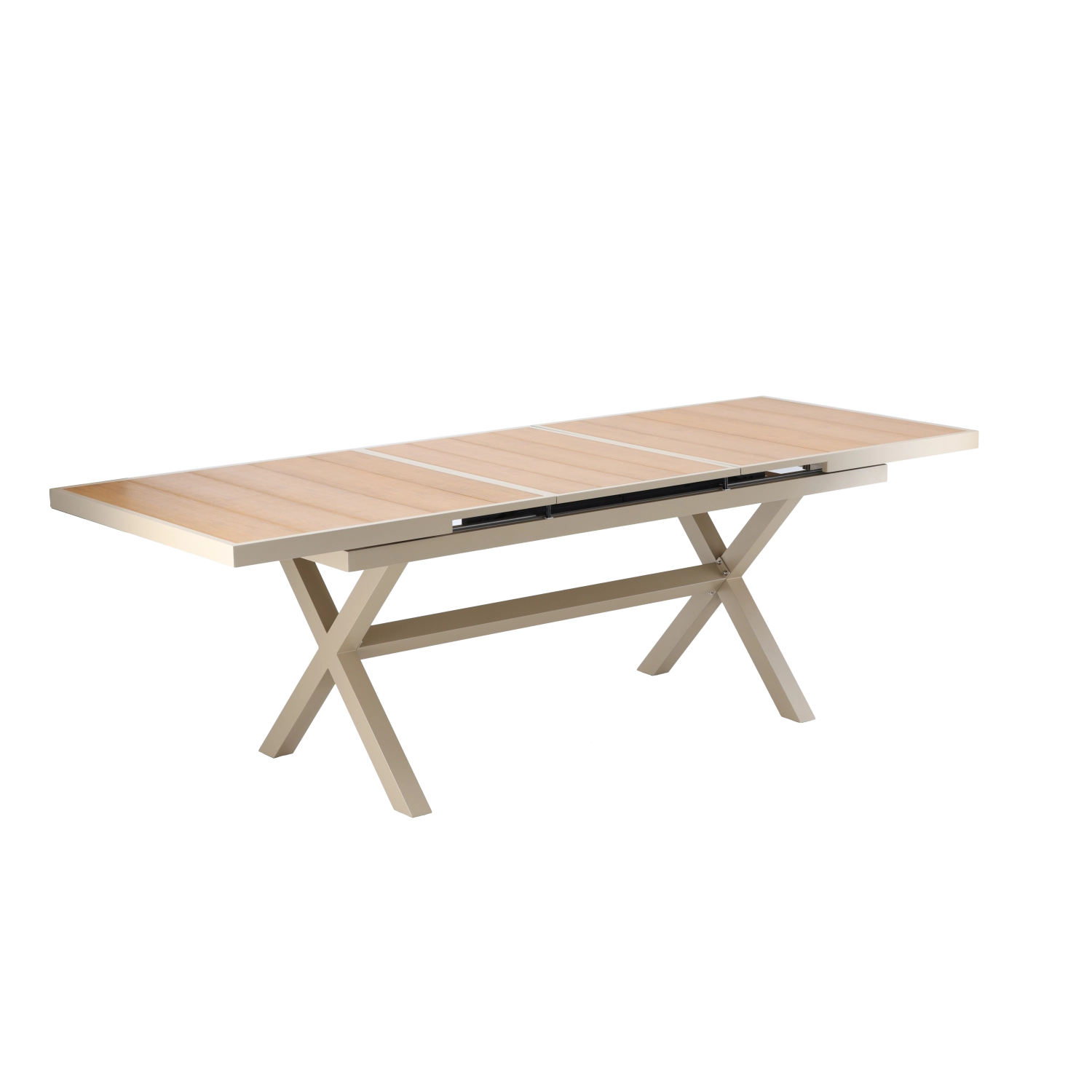 Geniet van comfortabel buiten tafelen dankzij het stevige kruisvormige onderstel en de stabiele constructie met poeder gecoate afwerking. De tafel past u moeiteloos aan uw actuele behoeften aan – van het dagelijkse diner tot grotere bijeenkomsten met familie en vrienden. Dankzij de neutrale beige kleur laat hij zich perfect combineren met diverse tuinsets.