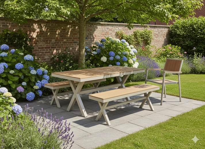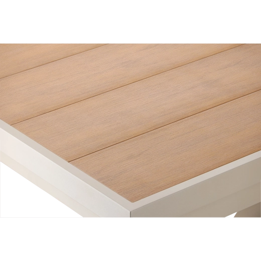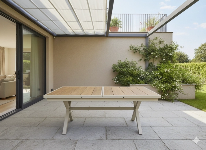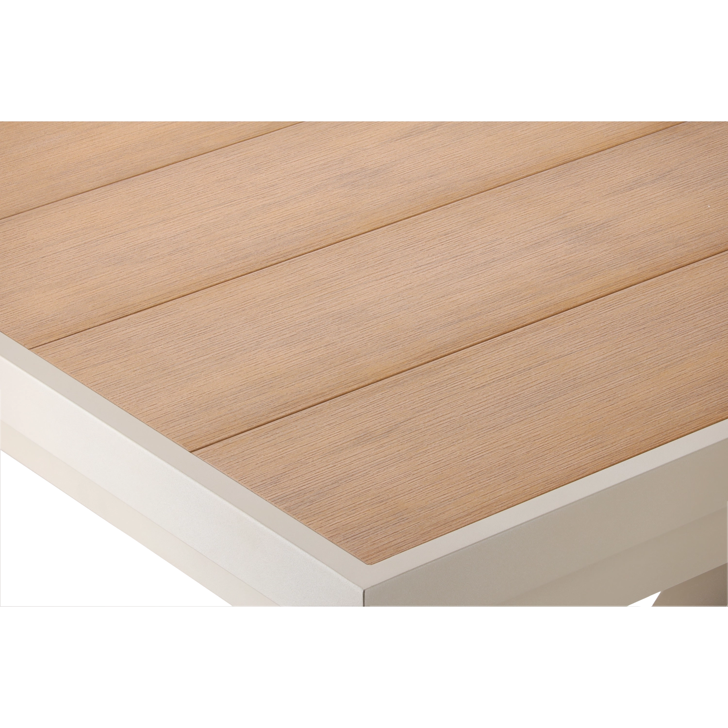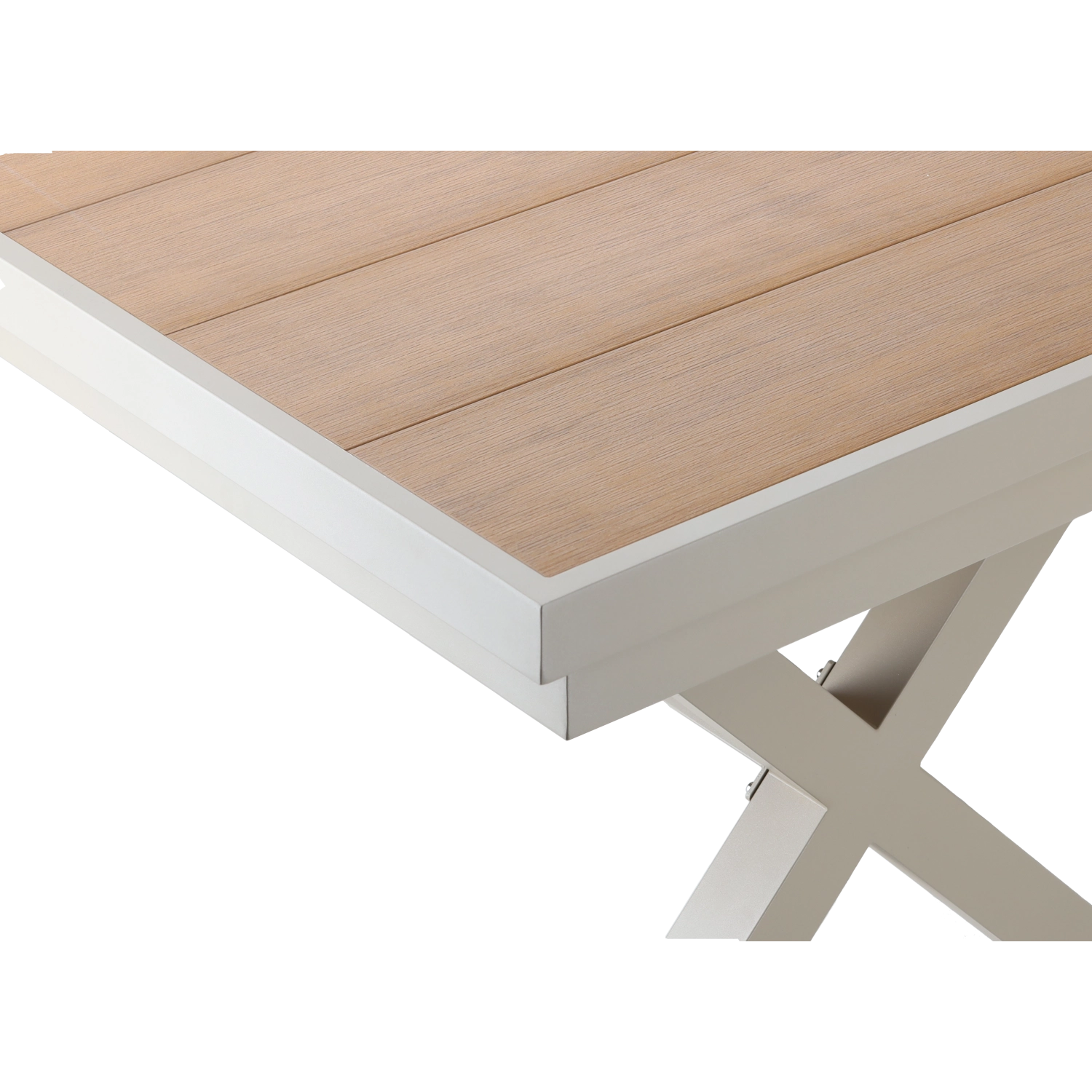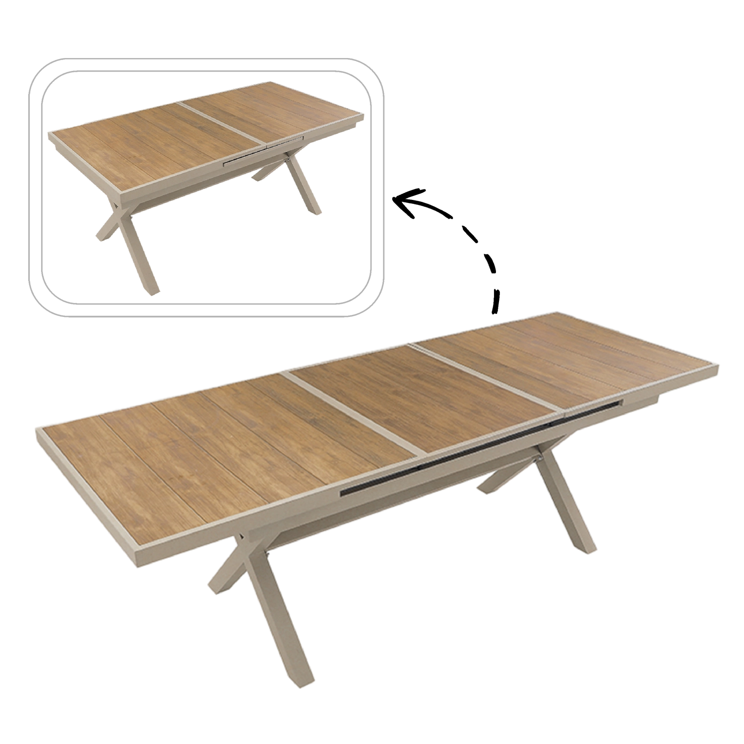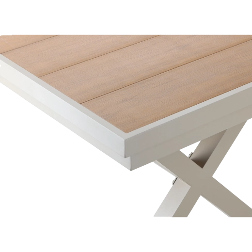 Geniet van comfortabel buiten tafelen dankzij het stevige kruisvormige onderstel en de stabiele constructie met poeder gecoate afwerking. De tafel past u moeiteloos aan uw actuele behoeften aan – van het dagelijkse diner tot grotere bijeenkomsten met familie en vrienden. Dankzij de neutrale beige kleur laat hij zich perfect combineren met diverse tuinsets.