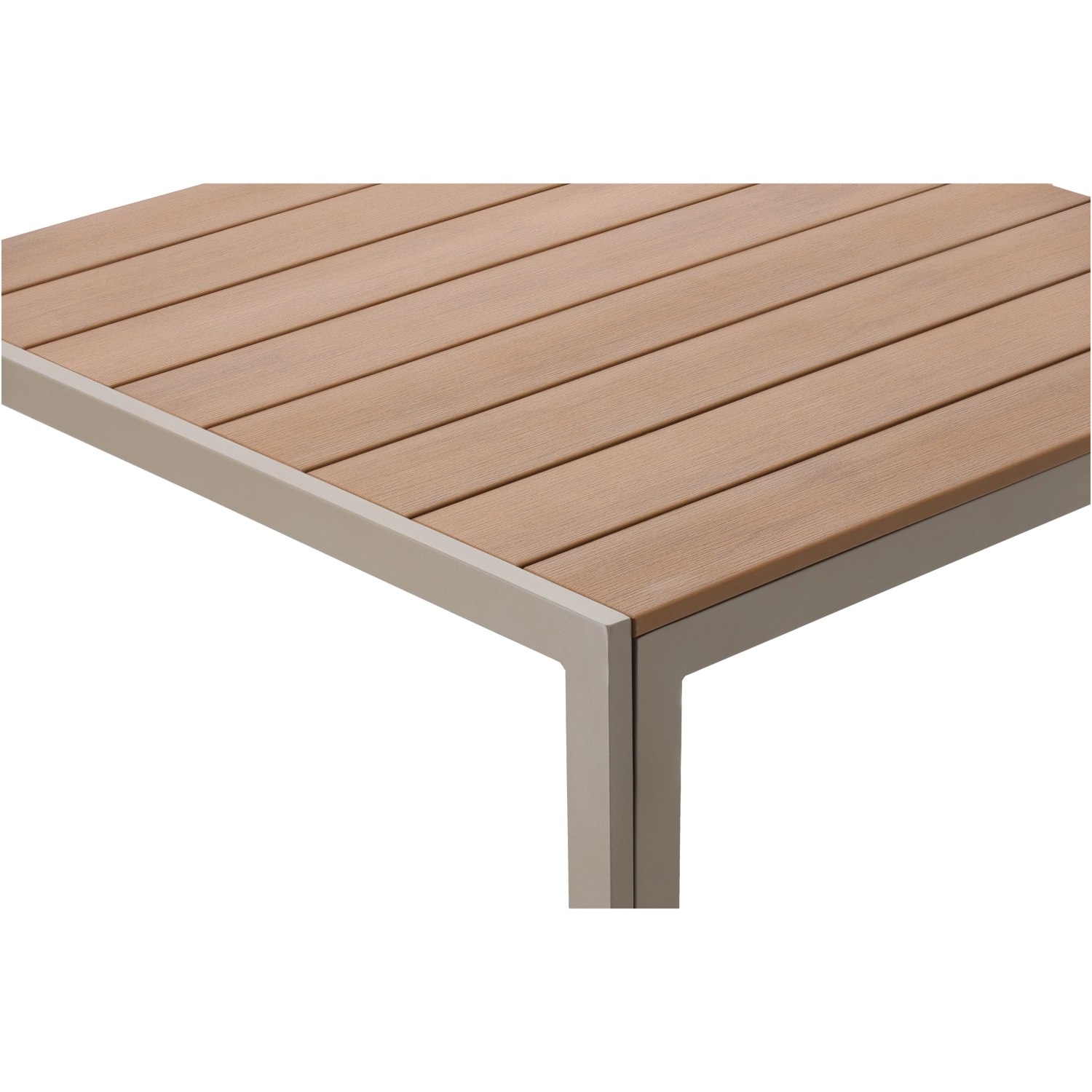 De moderne aluminium tafel met een blad van WPC-lamellen biedt een tijdloze uitstraling van natuurlijk hout zonder intensief onderhoud. Het oppervlak is poedergecoat en is daardoor uitstekend bestand tegen vocht, uv-straling en corrosie. De neutrale beige kleur laat zich eenvoudig combineren met uiteenlopende meubelstijlen en accessoires.