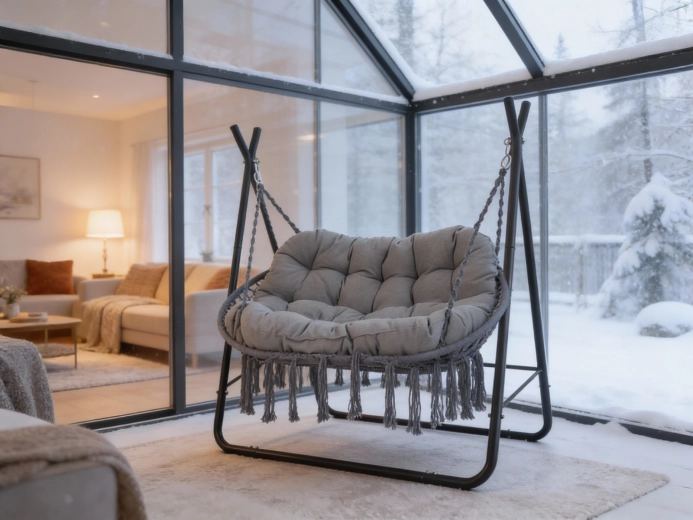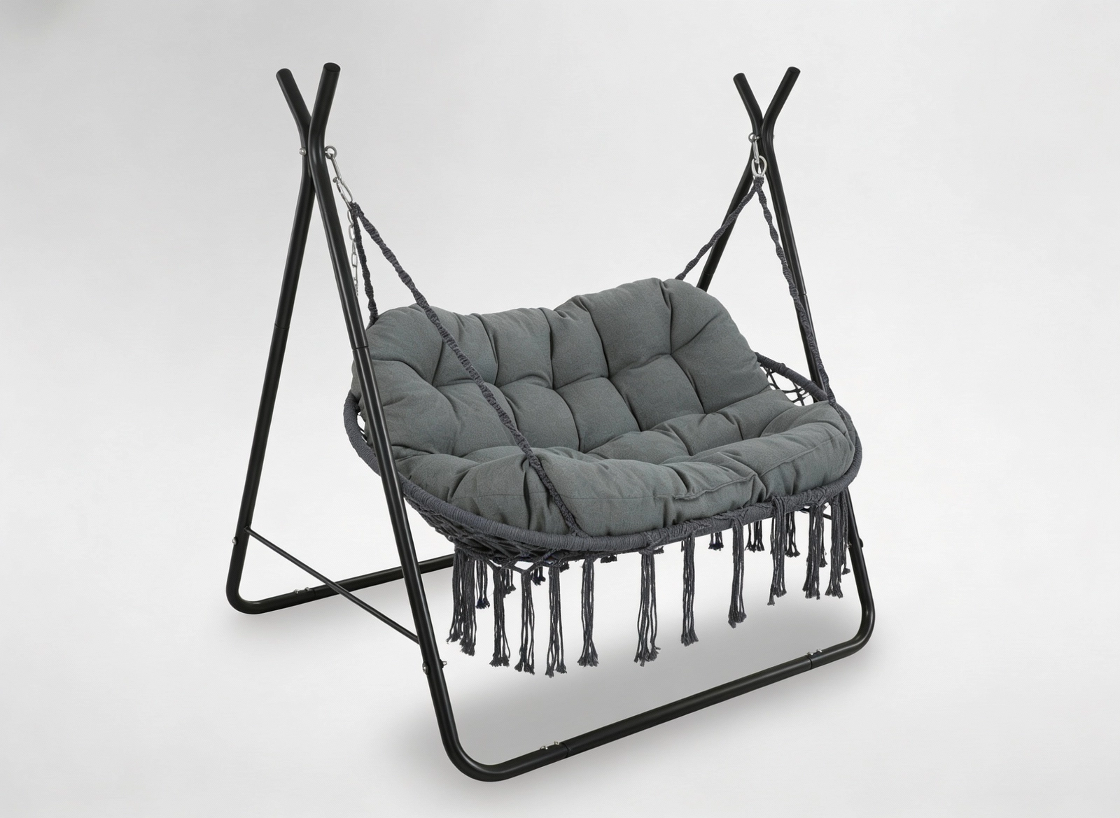 Dankzij het tweepersoons ontwerp geniet je van zacht schommelen alleen of met z’n tweeën. In de verpakking zitten karabiners en kettingen voor het eenvoudig ophangen van de kuip aan de standaard. De neutrale antracietkleur past perfect bij moderne en natuurlijke buitenruimtes en serres.