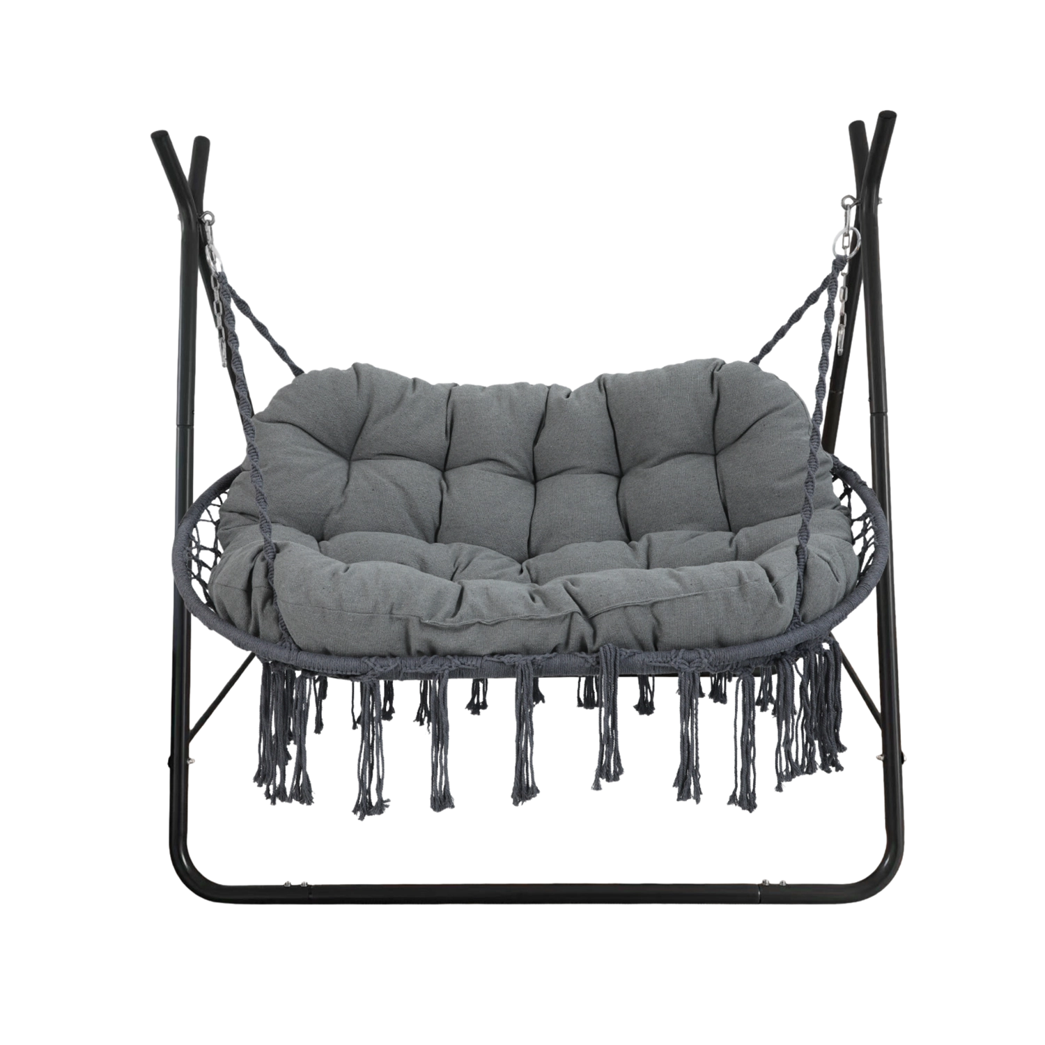 Geniet van ultieme ontspanning, binnen én buiten. Deze hangende schommelstoel voor twee personen combineert boho-stijl, een stevige stalen constructie en een extra zacht kussen voor comfortabel loungen op terras, balkon en in de tuin.