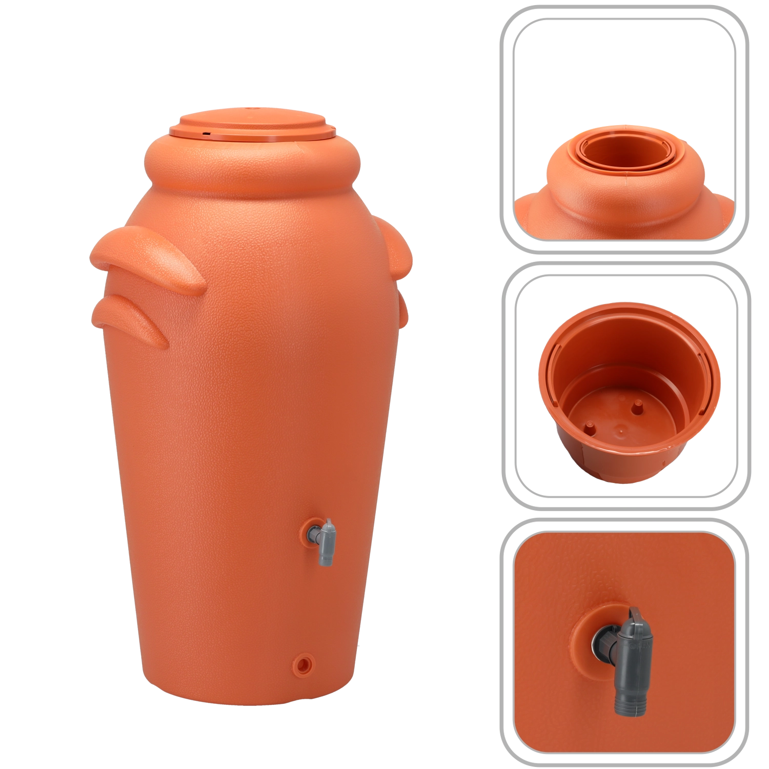 Eenvoudige bediening wordt verzekerd door de bovenste opening met deksel voor comfortabel vullen en de onderste schroefdraadaansluiting voor het aansluiten van een kraan of tuinslang. Door regenwater te gebruiken voor het bewateren van planten bespaart u kosten en ondersteunt u een duurzame tuinzorg.
