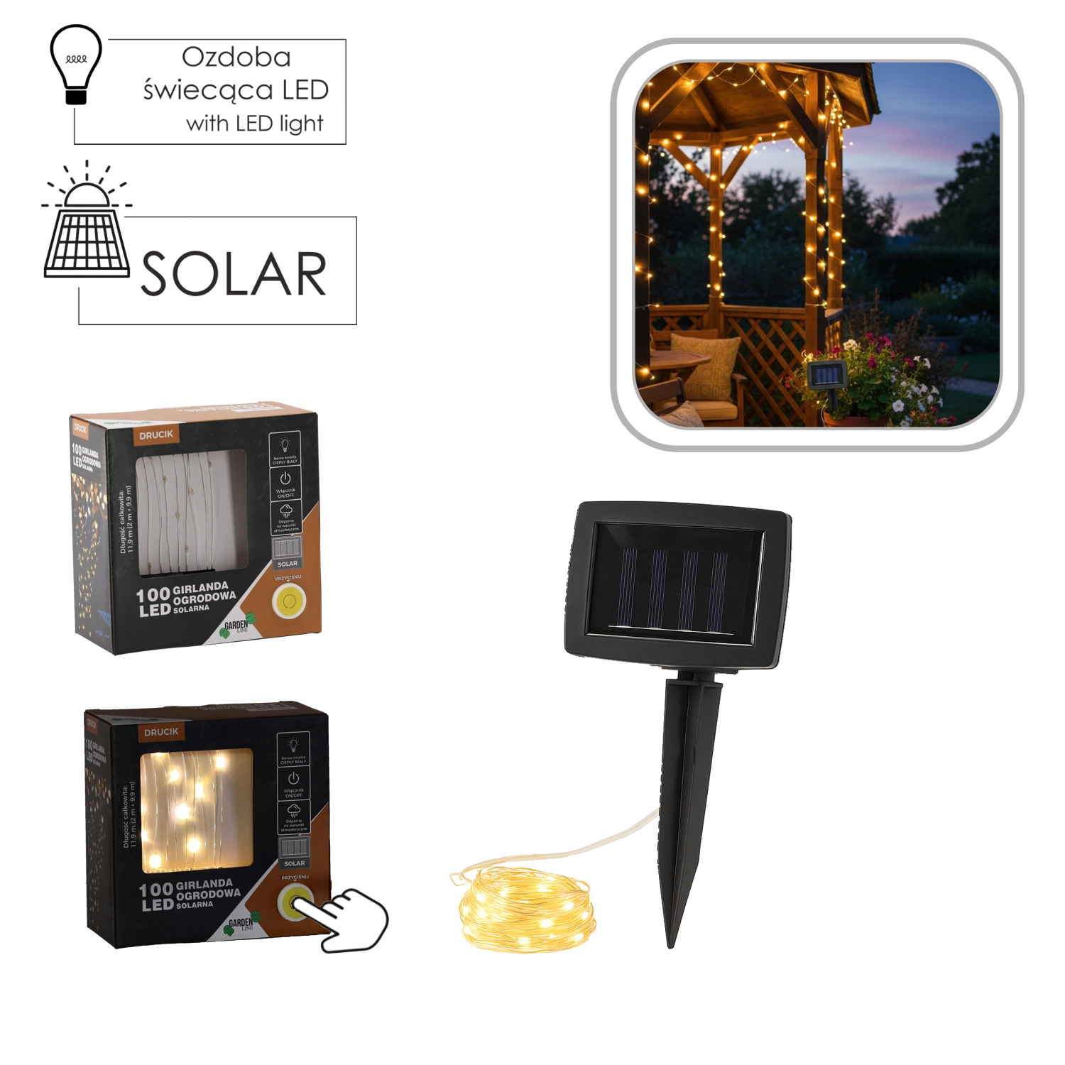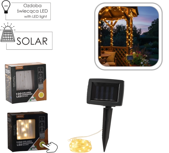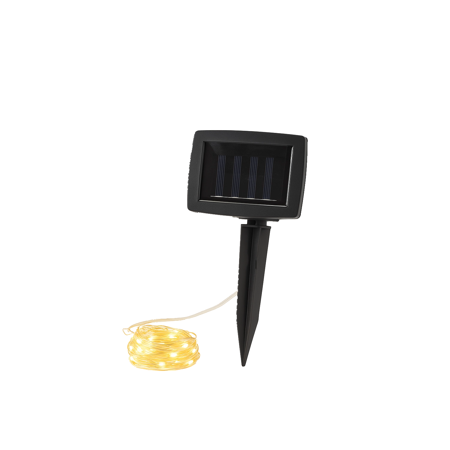 De zonne-LED-slinger brengt een aangename sfeer met warmwit licht in je buitenruimtes. De totale lengte van het verlichte deel is 9,9 m met een tussenafstand van 10 cm, wat zorgt voor een gelijkmatige en decoratieve verlichting van hekken, pergola’s, boompjes en balustrades. Voeding via een polykristallisch zonnepaneel en een oplaadbare Ni‑MH 1,2 V AA 400 mAh-batterij zorgt voor draadloze en onderhoudsarme werking.