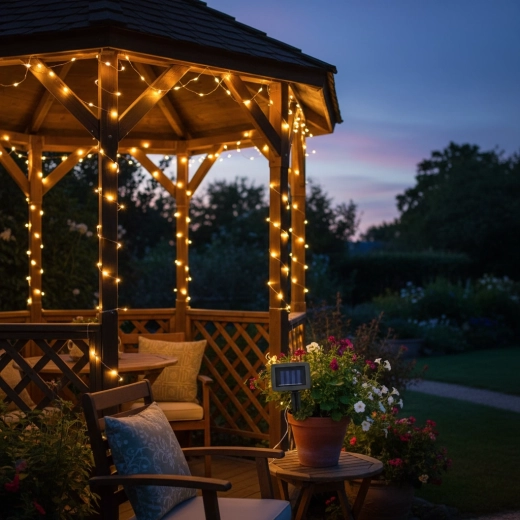 De slinger biedt constante verlichting of knipperen en is tegen vocht beschermd volgens IP44, waardoor hij bestand is tegen normale buitenomstandigheden. Na volledig opladen in de zon gedurende 7–8 uur brandt hij ongeveer 6–7 uur, ideaal voor zwoele zomeravonden.