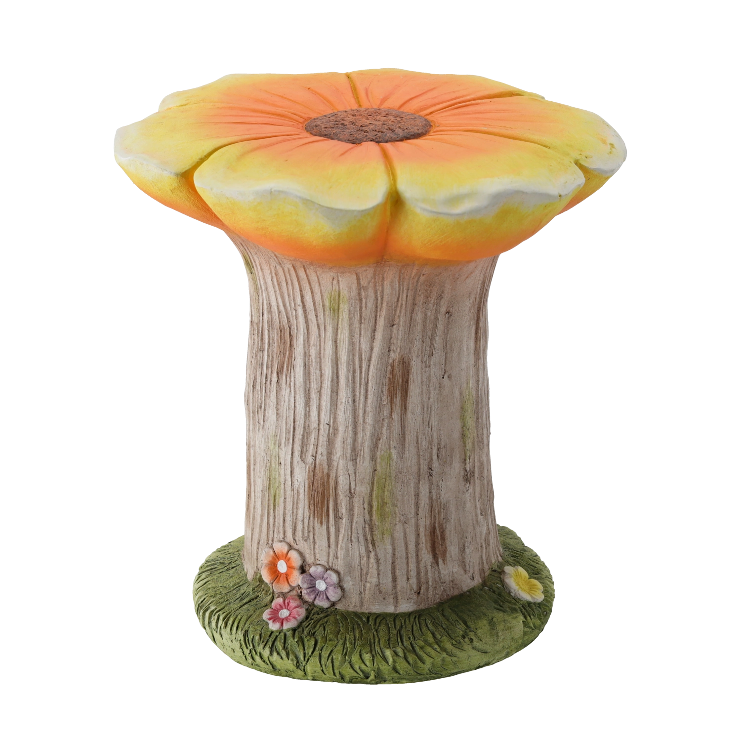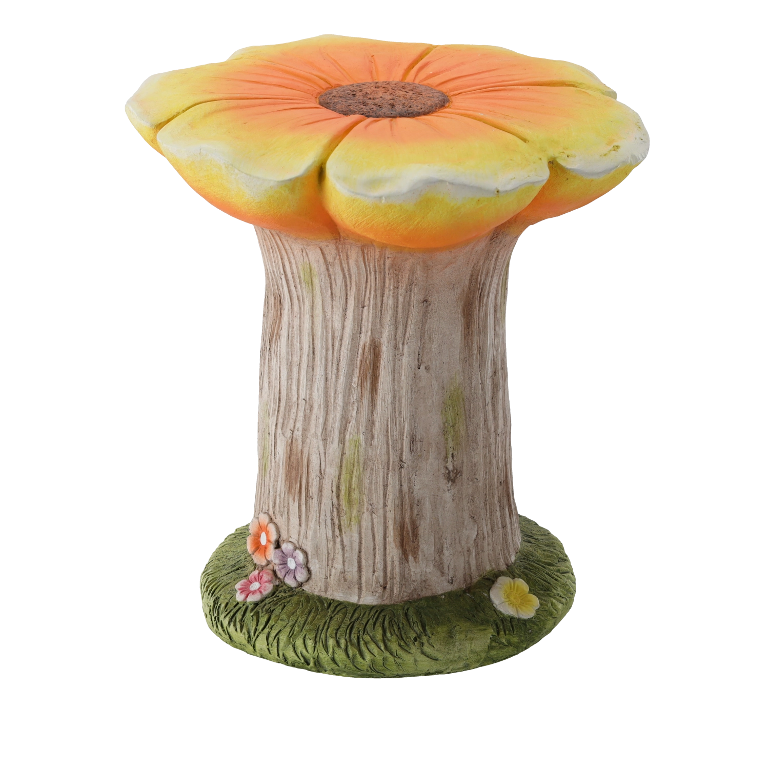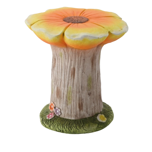 Deze originele tuinstandaard in de vorm van een bloem combineert esthetiek met functionaliteit. De realistische houttextuur, de geschilderde bloem in oranje tinten en de groene basis met kleine bloemetjes ogen natuurlijk en smaakvol. Dankzij de compacte afmetingen van 31 × 30,5 × 33 cm past hij ook op kleinere plekken, zoals balkons of terrassen.