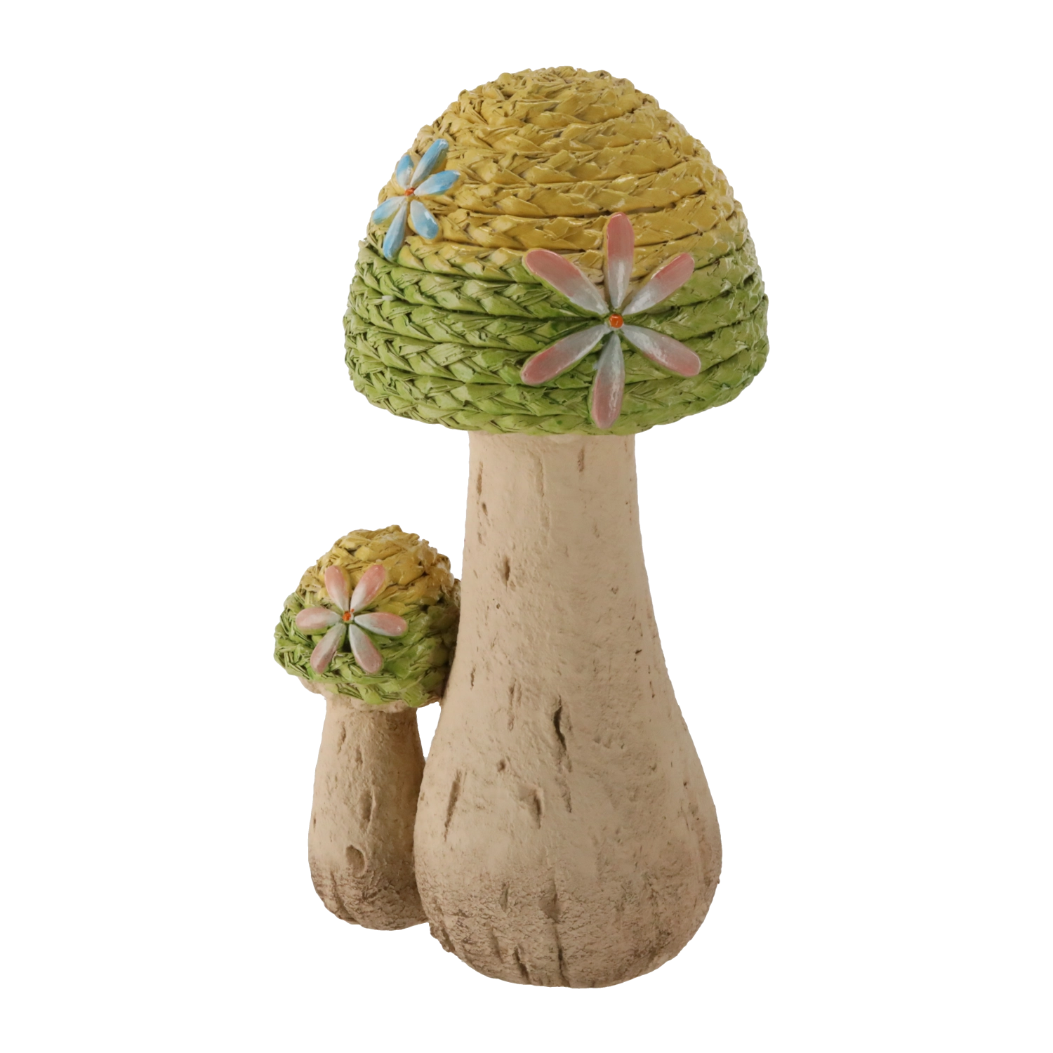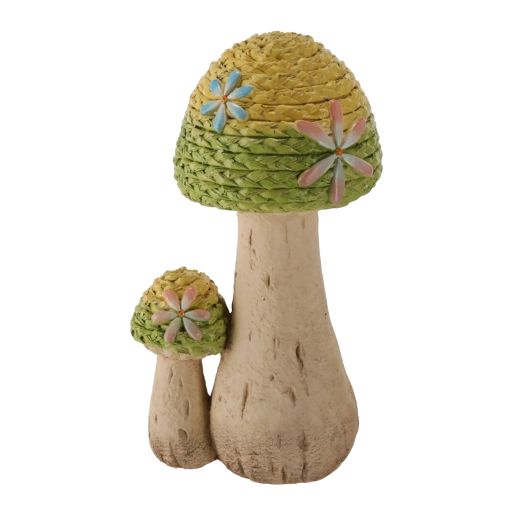 Dit elegante tuinsculptuur met het motief van gebreide paddenstoelen valt op door de fijne textuur en pasteltinten die de natuurlijke, handgemaakte uitstraling benadrukken. Dankzij de stabiele basis plaats je het gemakkelijk op diverse buitenoppervlakken.