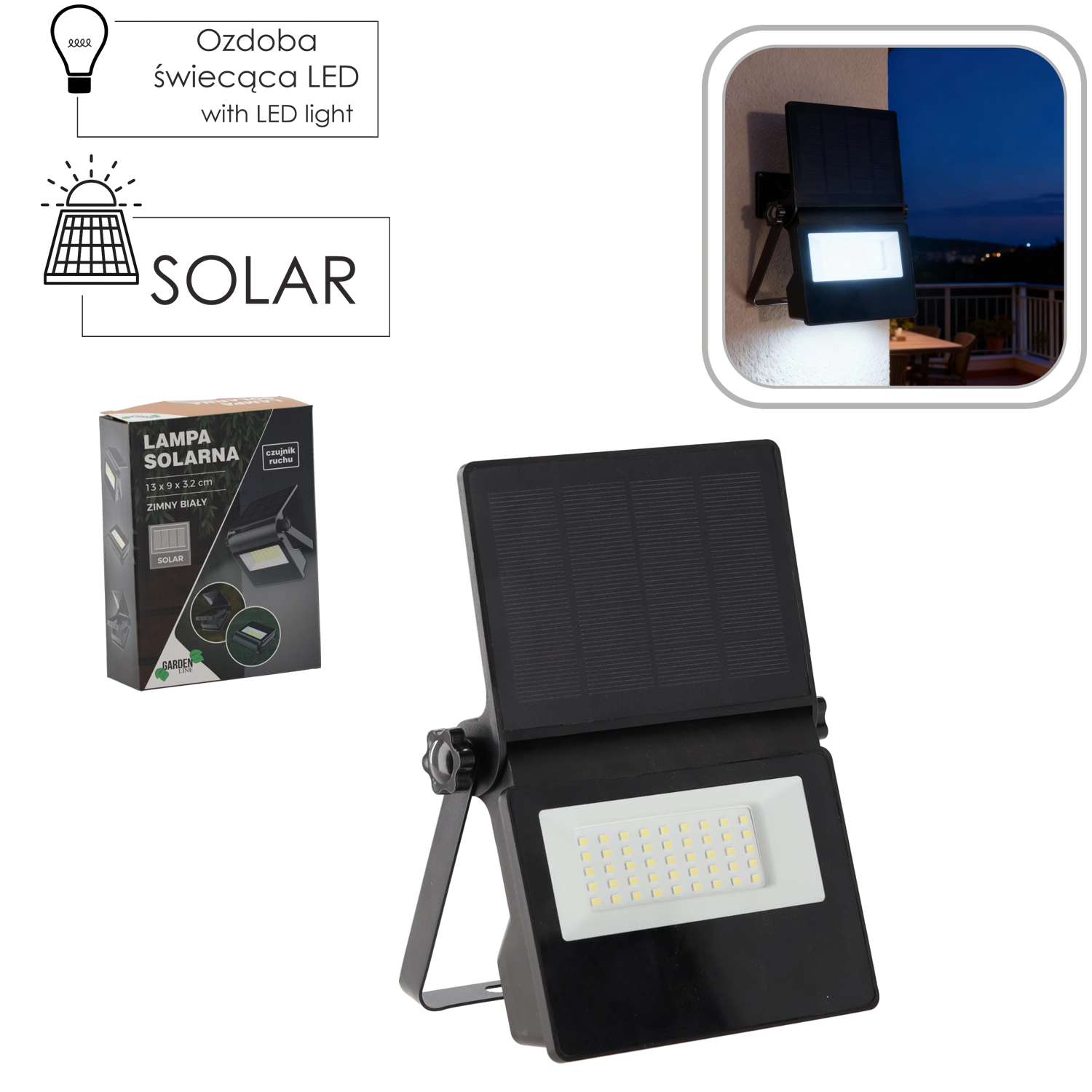 Praktische en zuinige buitenverlichting zonder bekabeling. De zonne-LED lamp met compacte afmetingen 13 × 9 × 3,2 cm laadt overdag automatisch op en bewaakt het gebied actief na zonsondergang. De geïntegreerde PIR-sensor schakelt het licht alleen in bij gedetecteerde beweging, wat energie bespaart en de accuduur verlengt.