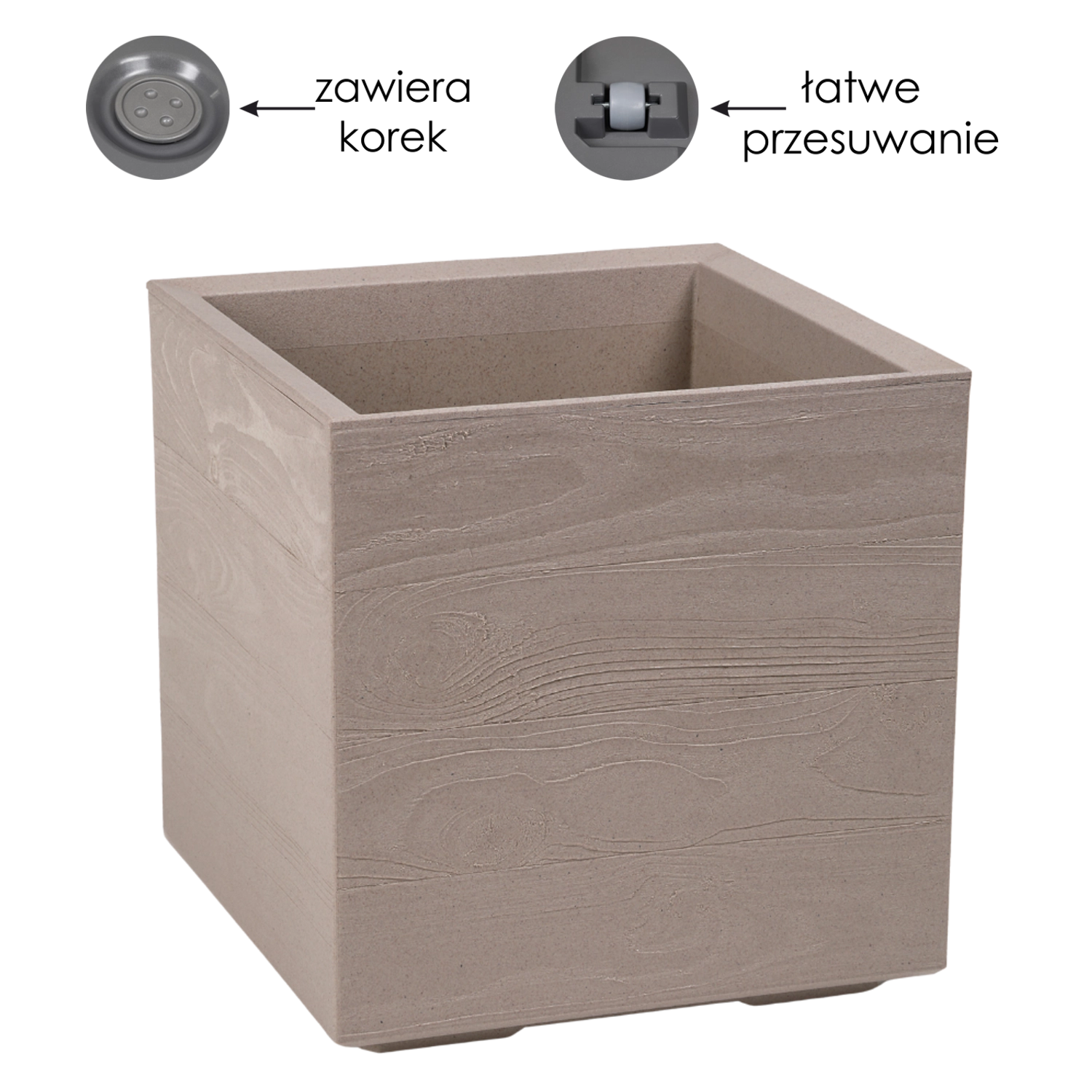 Breng een vleugje natuur in je huis of tuin. De Karo Eco Coffee bloempot in latte-kleur valt op door de authentieke houtimitatiestructuur en de matte afwerking, passend bij moderne interieurs en exterieurs. De royale afmetingen van 40 × 40 × 39,4 cm en het volume van 36 l zorgen voor ideale omstandigheden voor fittonia’s, monstera’s, aloë, tradescantia, varens, sansevieria en Mexicaanse reo.