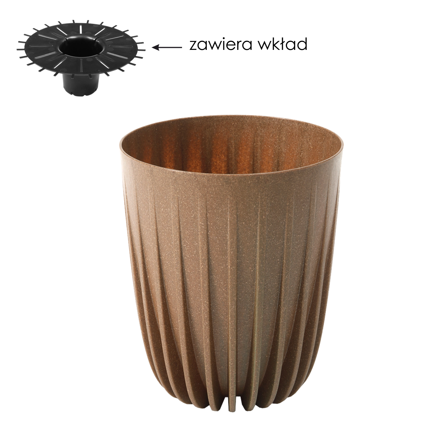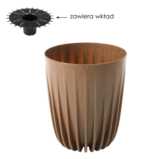 Stijlvolle bloempot MIRA ECO Wood met een diameter van 19 cm in natuurlijk houtdecor, met een modern geometrisch patroon en verticale groeven. Dankzij de grotere diepte is hij ideaal voor planten met een uitgebreid wortelstelsel en bevordert hij een gezonde groei. Het duurzame polypropyleen maakt het onderhoud eenvoudig, en de meegeleverde inzet met drainageopeningen zorgt voor optimale bewatering. Perfect geschikt voor zowel binnen als buiten en past bij diverse stijlen – van klassiek tot boho.