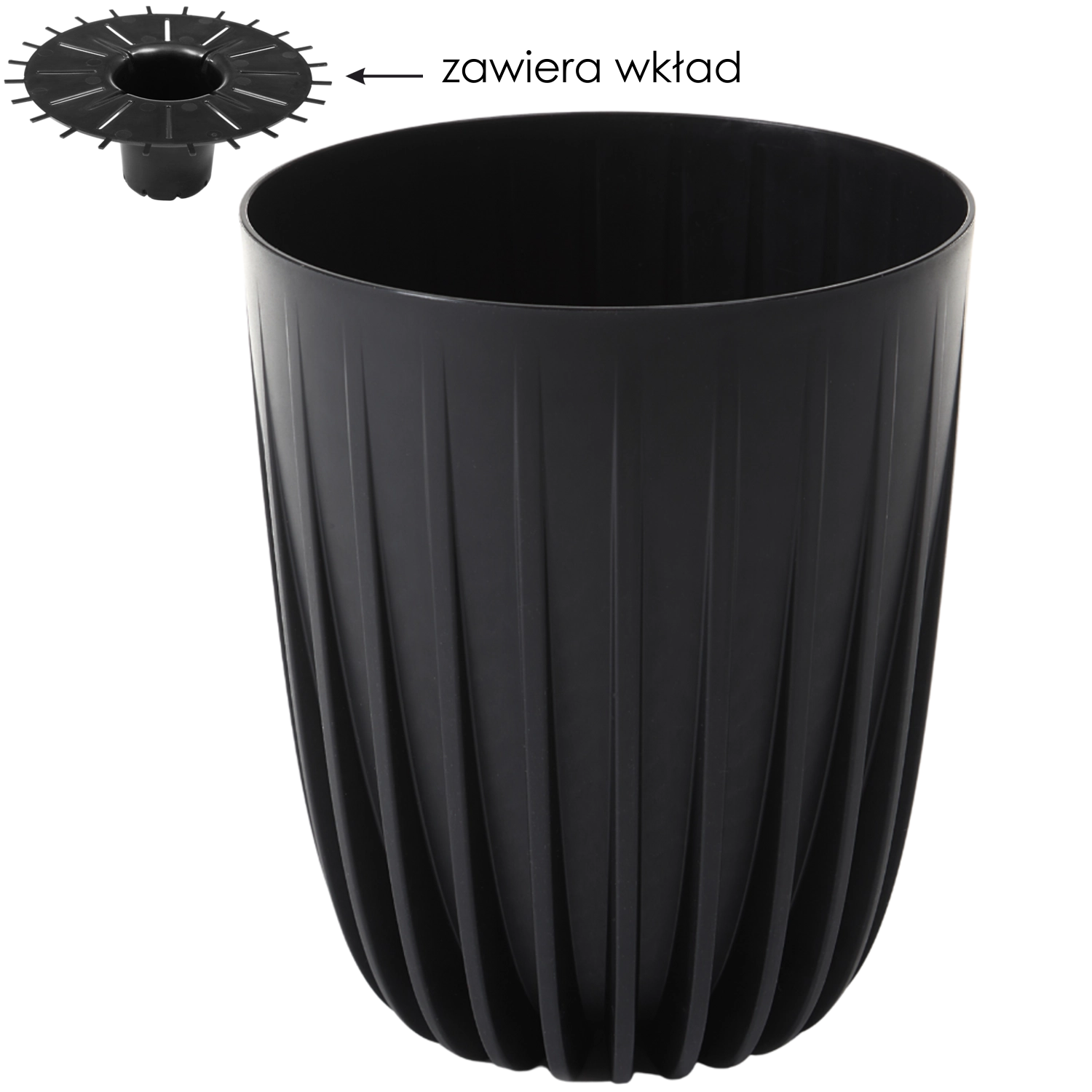 Stijlvolle bloempot van 100% gerecycled plastic met een diameter van 39 cm in elegant zwart. Dankzij het matte oppervlak en de verticale groeven past hij perfect in moderne en Scandinavische interieurs. De taps toelopende vorm oogt slanker en licht, de meegeleverde inzet bespaart potgrond en ondersteunt een optimale bewatering. Bestand tegen vorst en UV-straling – ideaal voor binnen en op terras of balkon.