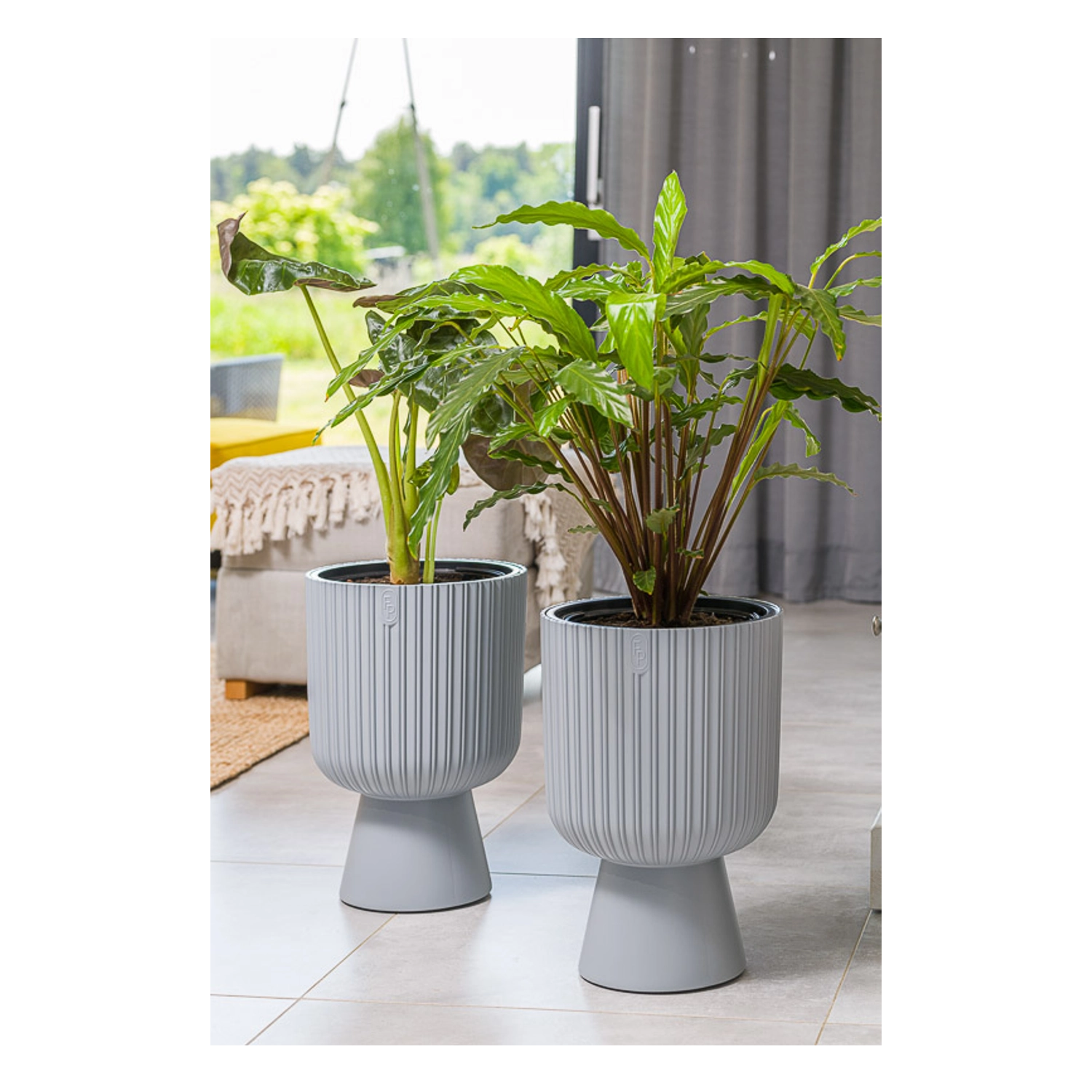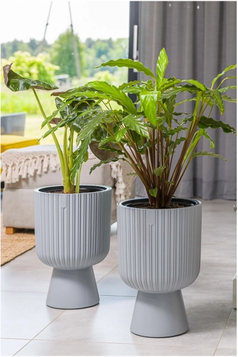 De stijlvolle bloempot Keli Mika in een verfijnde platinatint vult de woonkamer, het terras, balkon en de tuin perfect aan. De verticale groeven en de verbrede, gladde voet geven de ruimte een modern en strak uiterlijk, terwijl de duurzame constructie een lange levensduur garandeert, ook bij buitengebruik.