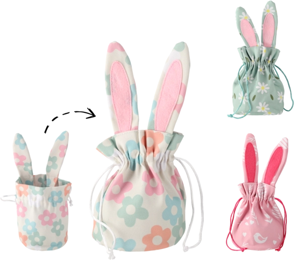 Schattig paasmandje met konijnenoorjes van 15,5 × 26 cm, ideaal als decoratie en voor het praktisch opbergen van kleinigheden. Biedt drie stijlvolle designs, stevige afwerking en voldoende ruimte voor eieren, snoep of kleine cadeautjes. Dankzij de hoogwaardige materialen en het universele design past het niet alleen met Pasen, maar ook als decoratie het hele jaar door.