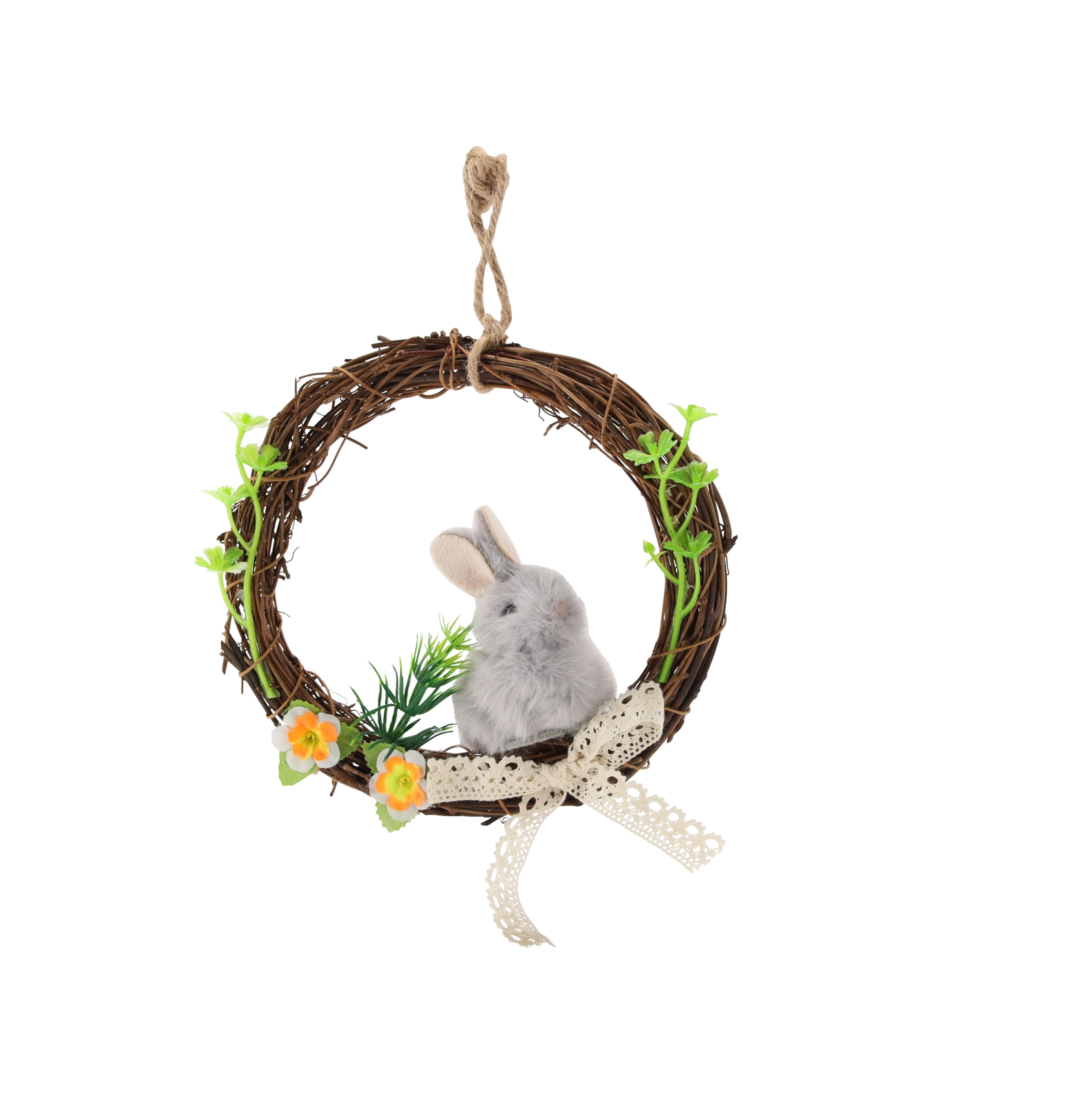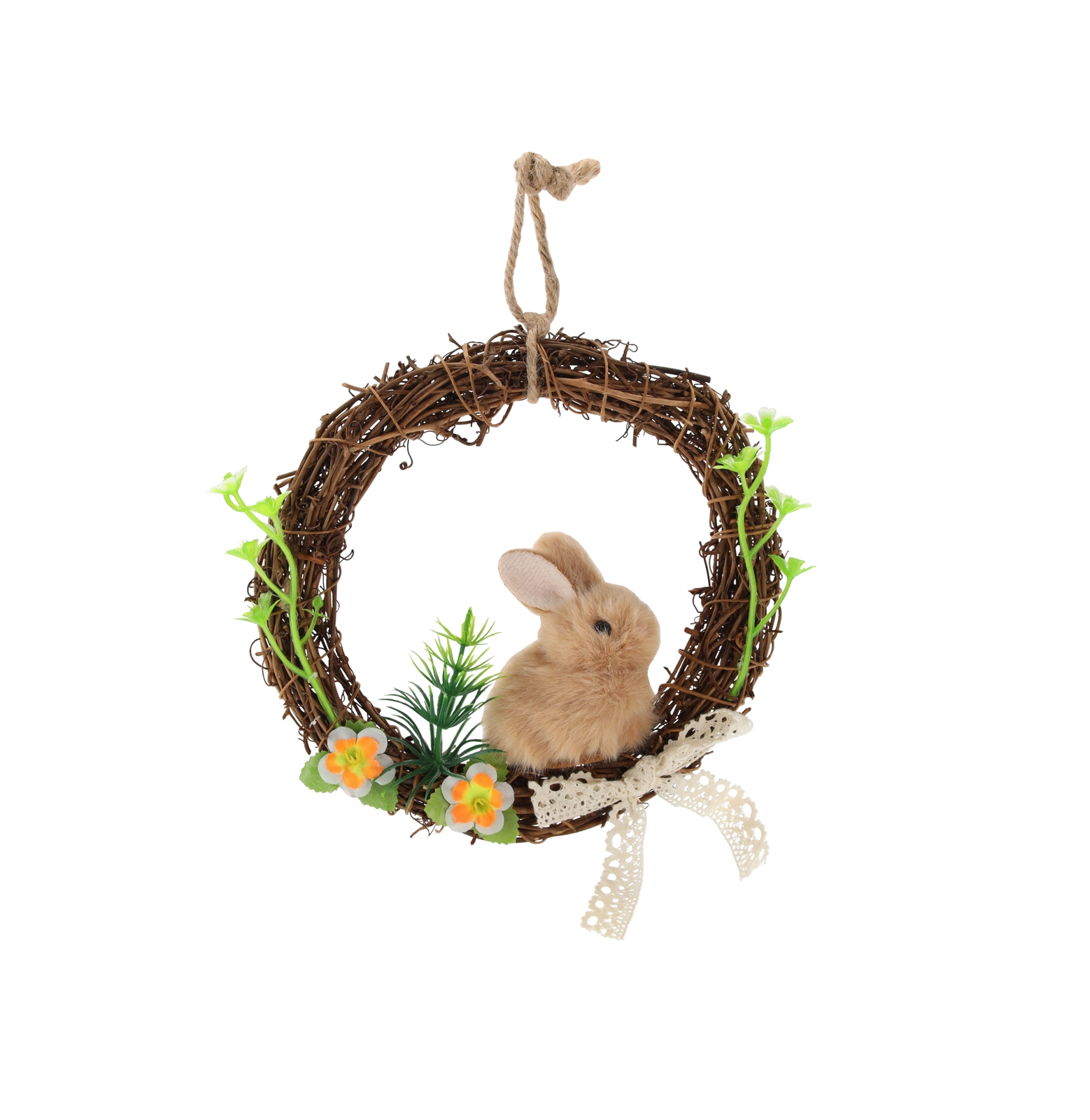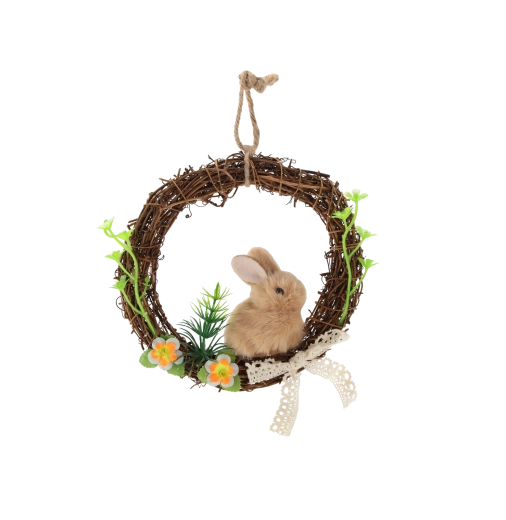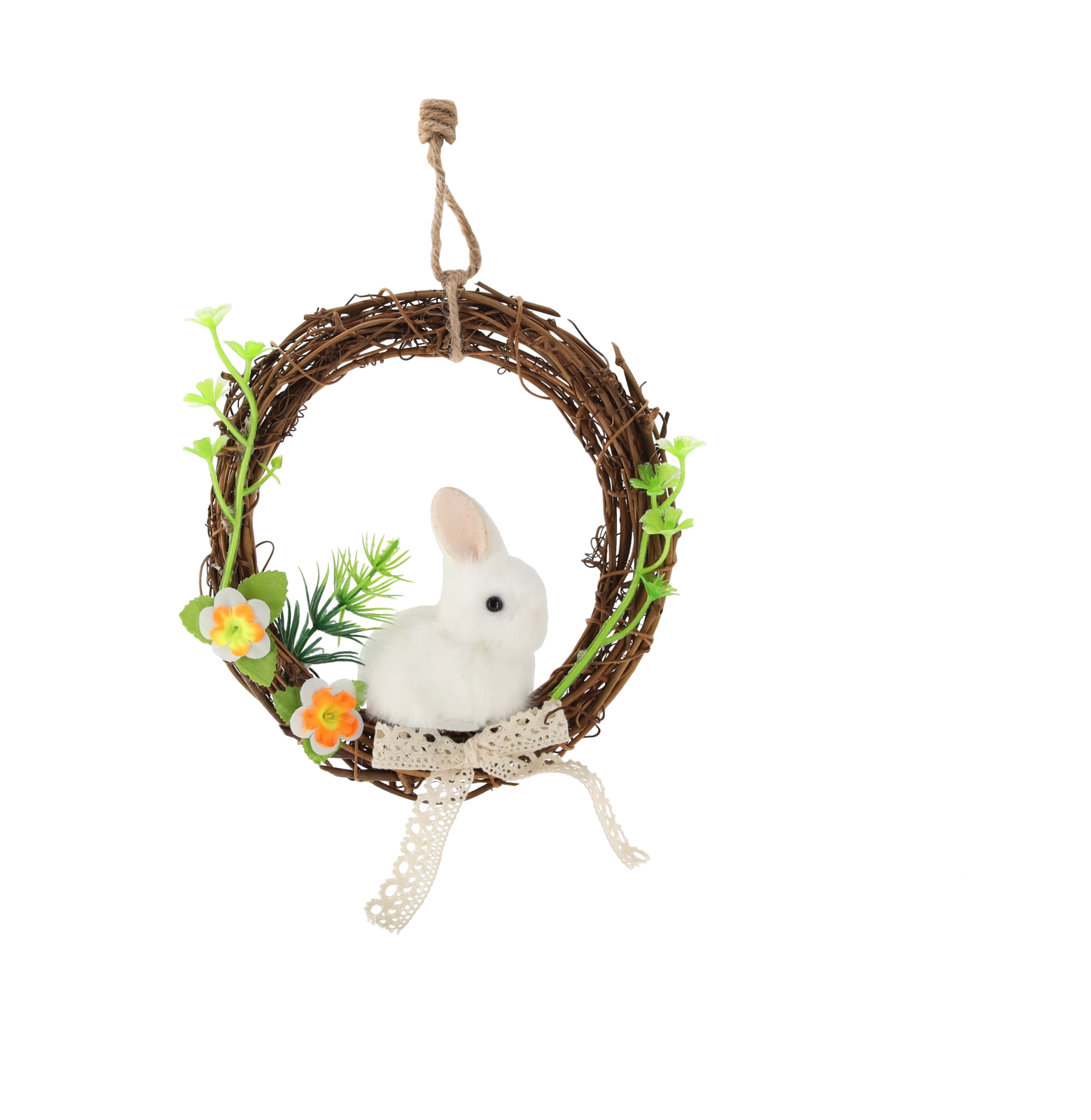 Het zachte pluchen konijntje geeft de krans speelsheid en maakt hem tot een ideale paasaccent voor de hal of woonkamer.