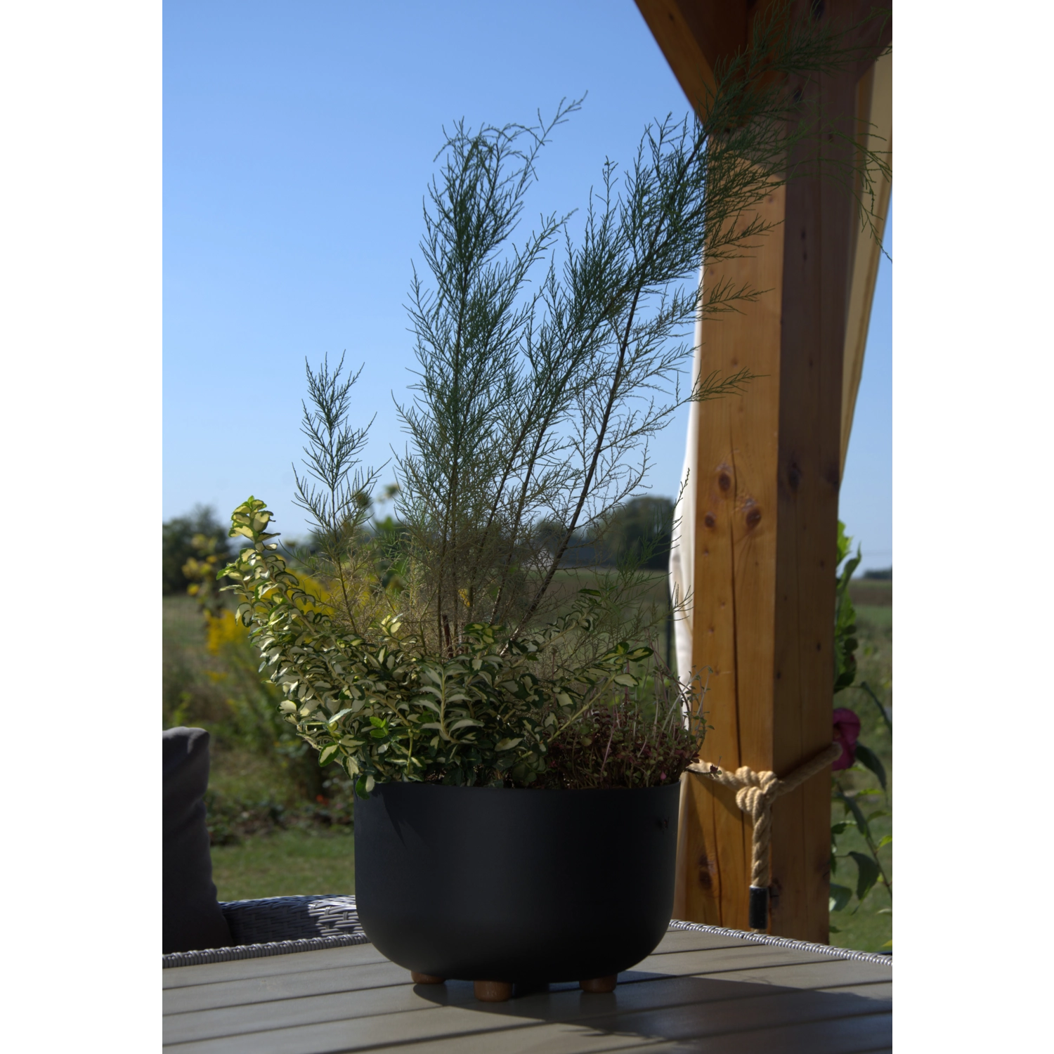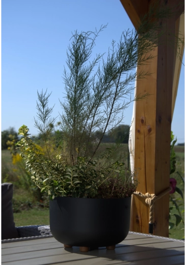 De bloemenschaal Sofia brengt een pure loft-look in je huis en op je terras. De matzwarte afwerking oogt tijdloos, terwijl de pootjes met houtimitatie voor lichtheid en een elegant contrast zorgen. Dankzij het hoogwaardige gerecyclede plastic is de schaal licht, duurzaam en gemakkelijk te onderhouden.