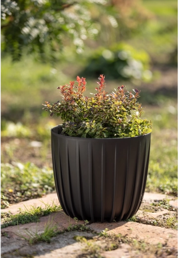 De stijlvolle en functionele bloempot Mira past in woningen, kantoren en op balkon, terras of in de tuin. Fijne verticale groeven accentueren de moderne look en de zwarte kleur laat zich gemakkelijk combineren met elk interieur. Dankzij de inzet worden planten efficiënter bewaterd en wordt het risico op overbewatering verminderd.
