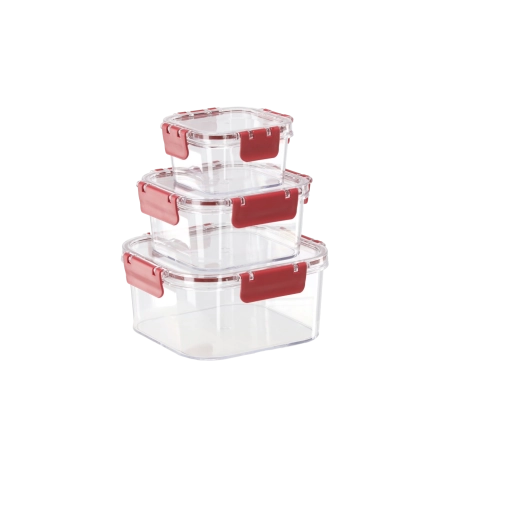 Houd orde in de keuken met deze set van drie onderling stapelbare vierkante bakjes. De verschillende formaten 0,4 l, 0,9 l en 1,8 l zijn geschikt voor alles: van snacks en restjes tot grotere porties. Transparante wanden maken directe controle van de inhoud mogelijk zonder te openen en de afsluitende deksels met clips beschermen tegen geurverlies en uitdroging.