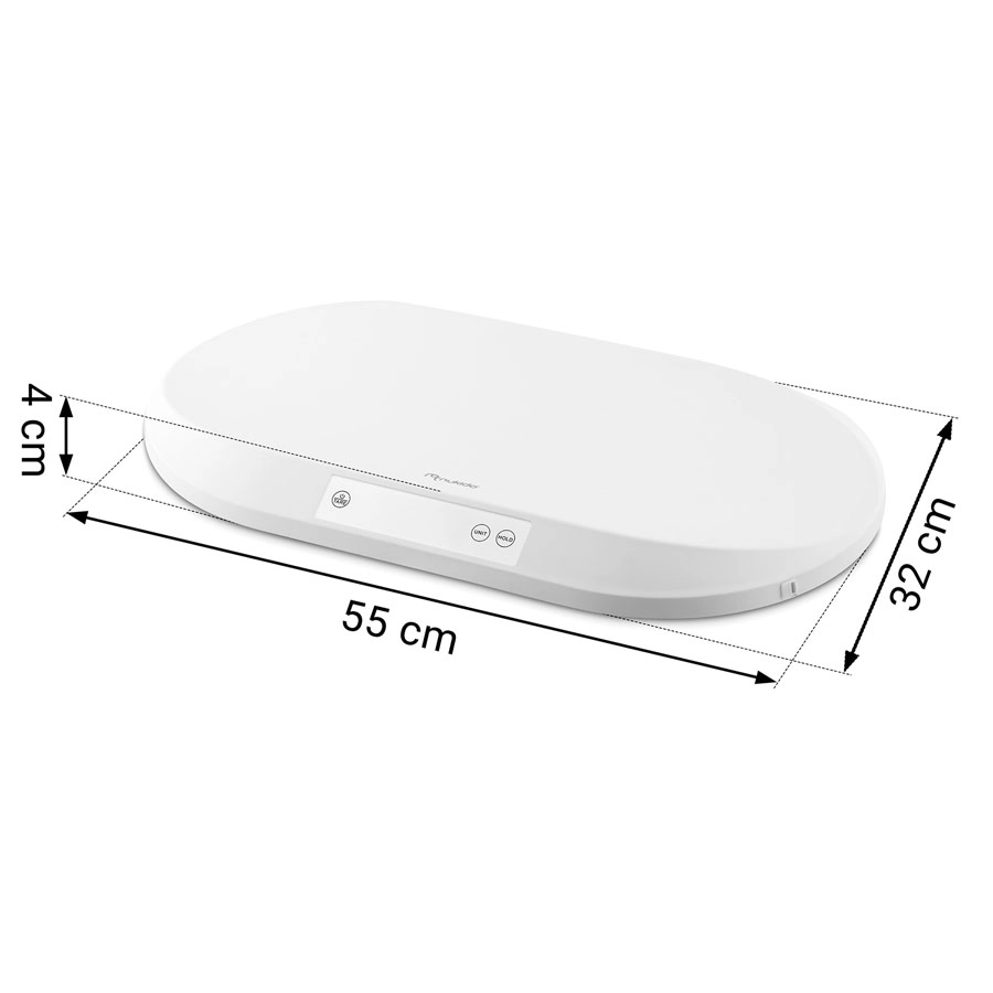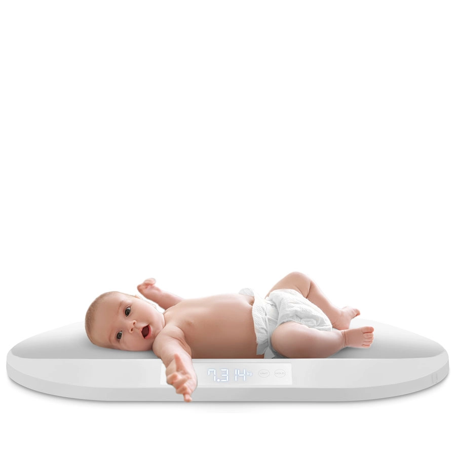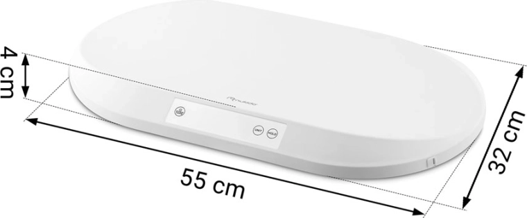 De HOLD-functie houdt de gemeten waarde vast, zelfs wanneer het kind beweegt, en TARE maakt het mogelijk om het gewicht van onderleggers of handdoeken af te trekken. Dankzij het kunnen wisselen tussen eenheden g / kg / oz / lb pas je de meting aan je voorkeur aan. Het praktische geïntegreerde meetlint helpt bij het controleren van hoofdomtrek of lengte tot 150 cm, zodat je een compleet beeld van de ontwikkeling hebt.