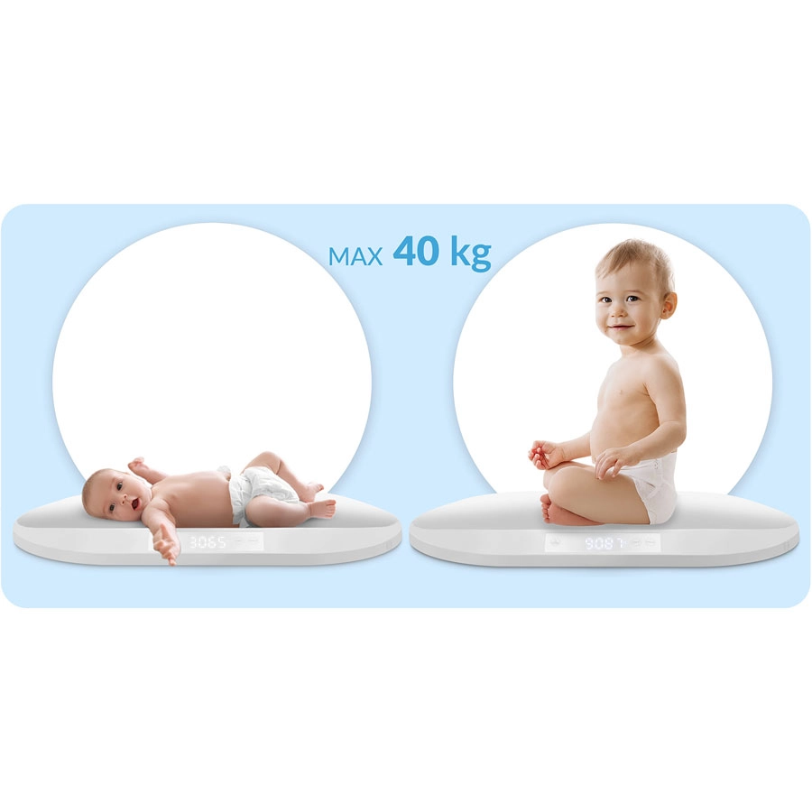 De weegschaal is gemaakt van veilig en duurzaam ABS en wordt gevoed door standaard AAA-batterijen (meegeleverd). Dankzij het maximale draagvermogen van 40 kg gebruik je het apparaat niet alleen in de babytijd, maar ook in de daaropvolgende kinderjaren.