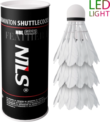 De Nils NBL6223 badmintonshuttles combineren een traditionele korf van eendenveren met moderne LED-technologie. Dankzij de aerodynamische eigenschappen van de veren zijn de shuttles sneller en is het spel dynamischer. De nauwkeurig uitgebalanceerde basis van EVA-materiaal zorgt voor een stabiele baan en zeker plaatsen van slagen.