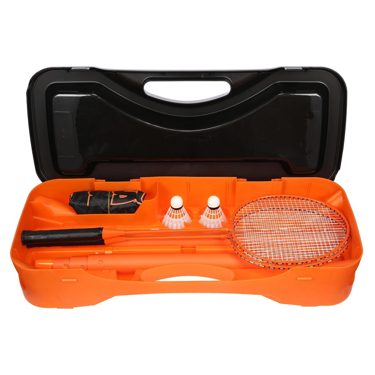 De stevige kunststof koffer met vakken houdt net, palen, rackets en shuttles overzichtelijk en veilig bij elkaar. Makkelijk te dragen en razendsnel speelklaar, waar je ook bent.