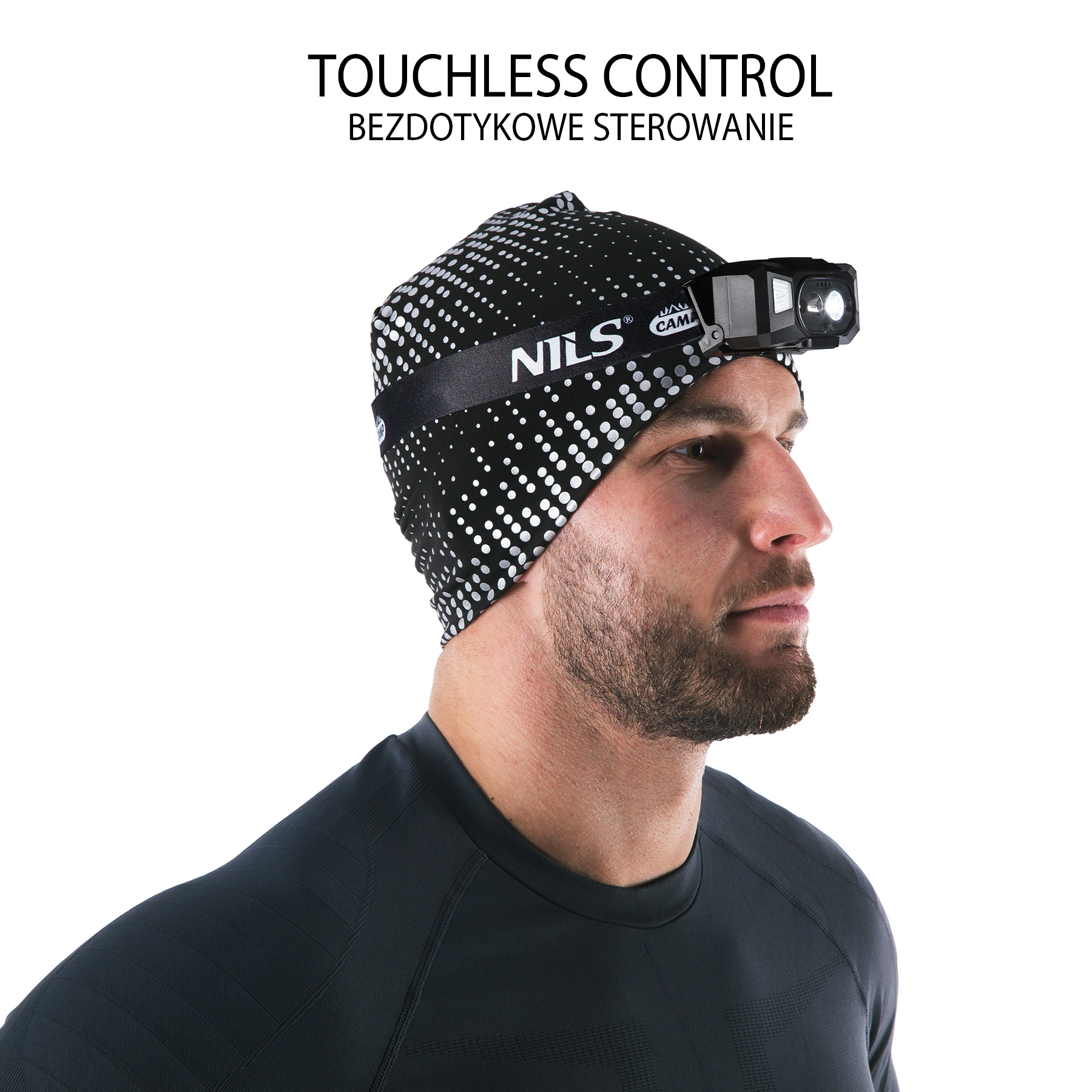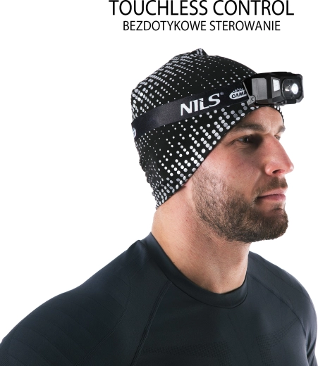 Lichte en duurzame LED-hoofdlamp van NILS CAMP met een vermogen van 600 lm, voorzien van aanraakloze bediening, meerdere lichtstanden (koel/warm wit, rood licht), USB-opladen en powerbankfunctie. Dankzij de IPX5-waterbestendigheid en de verstelbare band is hij ideaal voor hardlopen, kamperen, fietsen en werk.