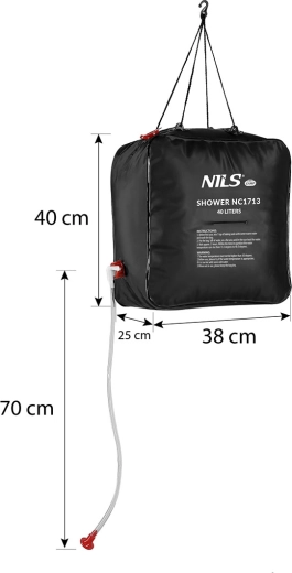 Geniet van het comfort van warm water, ook buiten de bewoonde wereld. De NILS Camp zonne-douche met een inhoud van 40 liter wordt natuurlijk verwarmd door zonne-energie – het zwarte materiaal versnelt de opwarming en het water kan temperaturen tot 48 °C bereiken. Dankzij 4 ogen en meegeleverde koorden met haak hang je hem eenvoudig op aan een tak, luifel of dakdrager.