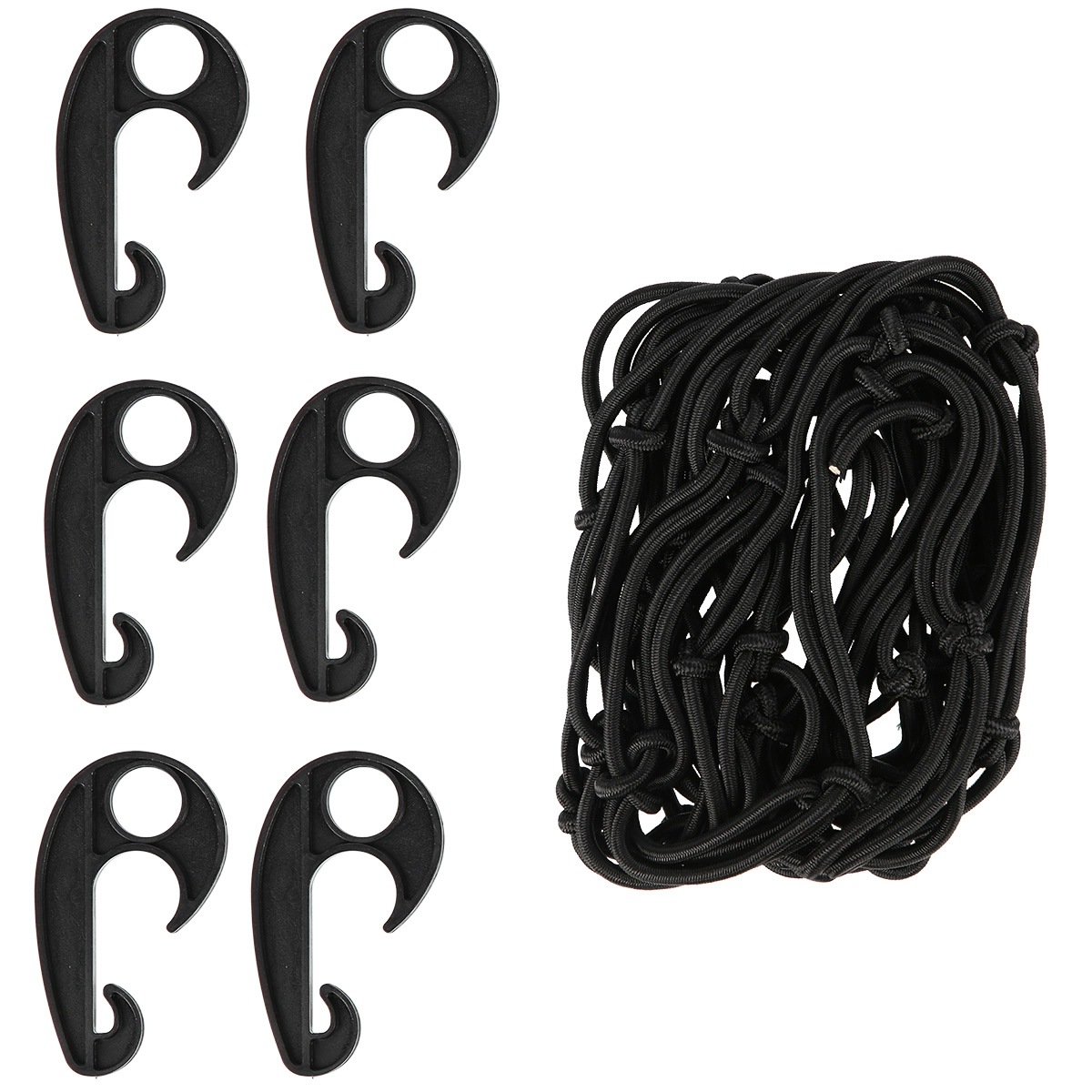 In de verpakking zitten 6 kunststof haken, die snelle bevestiging mogelijk maken aan de ogen van de kar, de kofferbak van de auto of andere ankerpunten. Het net is licht, compact op te bergen en altijd klaar om te helpen tijdens het kamperen, onderweg en thuis.