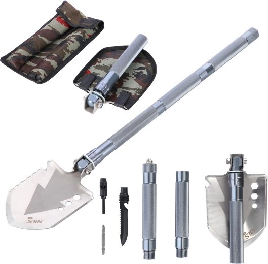 Universele outdoor-schep die kracht, duurzaamheid en laag gewicht combineert. Gemaakt van roestvrij staal en aluminium en biedt een breed scala aan functies – van spade, hak en zaag tot mes, vuursteen, schroevendraaiers en fluitje. In uitgevouwen toestand stabiel en efficiënt, na inklappen compact en gemakkelijk te dragen in de meegeleverde hoes – ideaal voor kamperen, trekking en noodsituaties.
