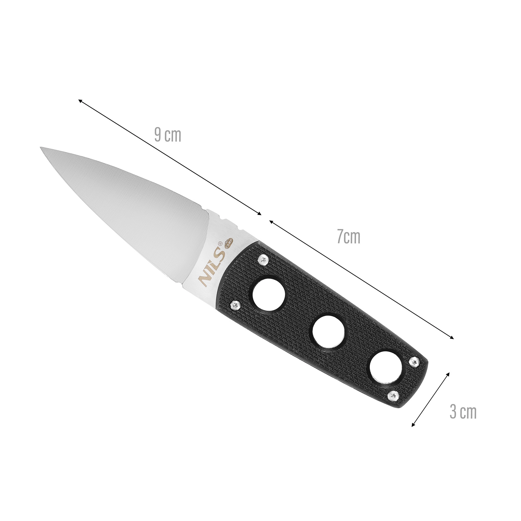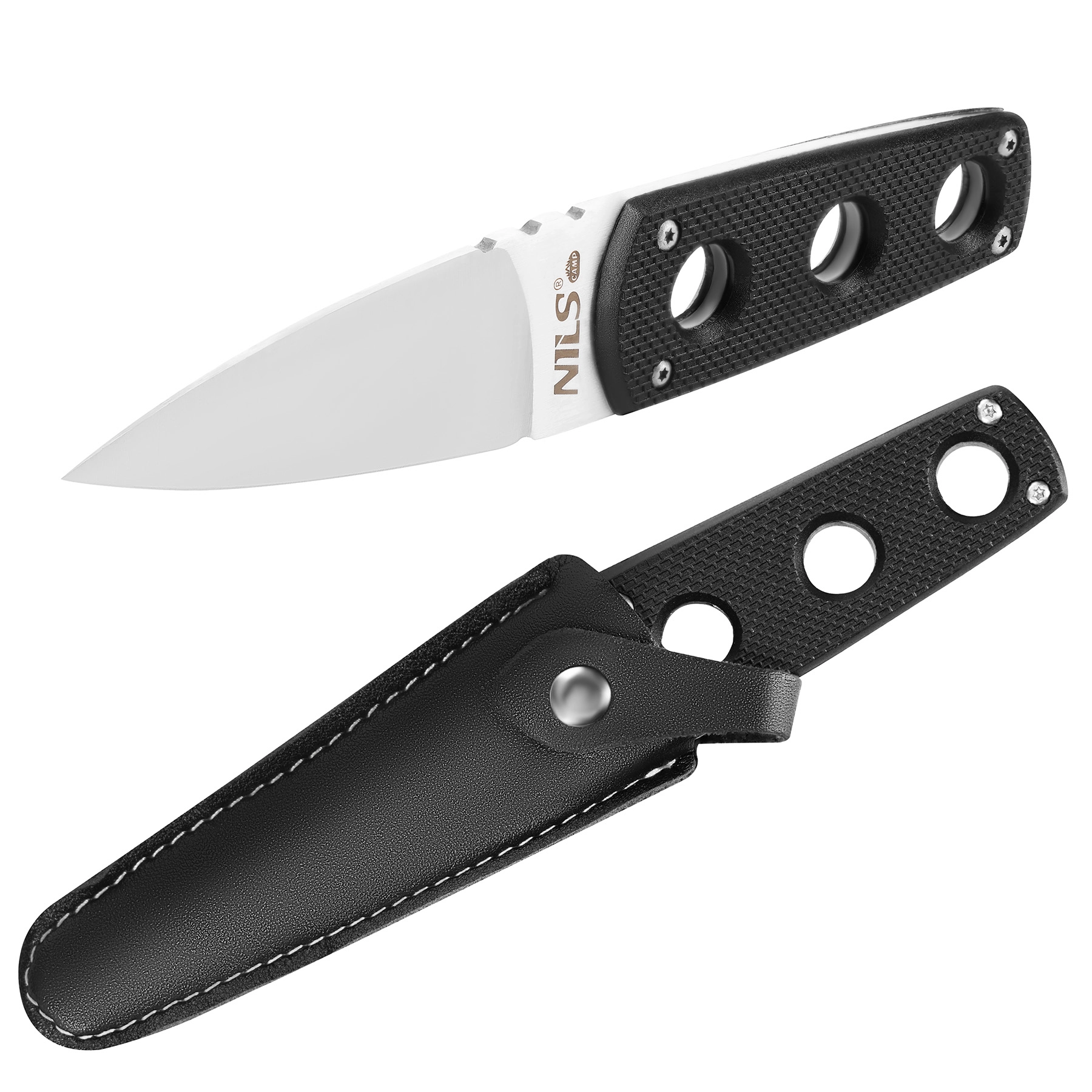 Het ergonomische handvat met antisliptextuur zorgt voor een zekere grip, zelfs nat of met handschoenen. De beschermende schede met mogelijkheid tot bevestiging aan riem of rugzak houdt het mes veilig bij de hand tijdens verplaatsingen door het terrein.