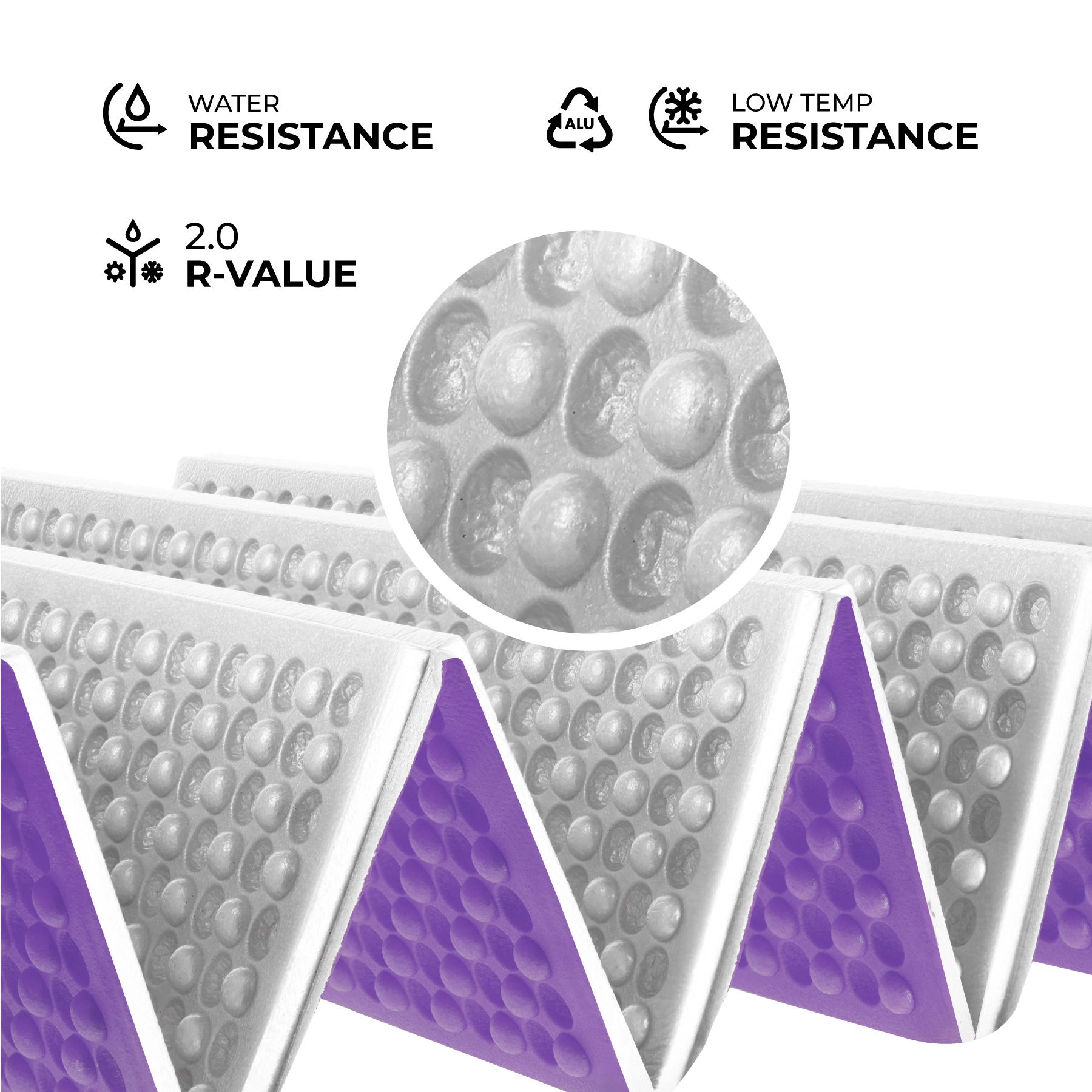 Weerkaatst lichaamswarmte terug naar de gebruiker of isoleert tegen de koude grond, afhankelijk van de oriëntatie van de mat. Geschikt voor gebruik in drie seizoenen.
