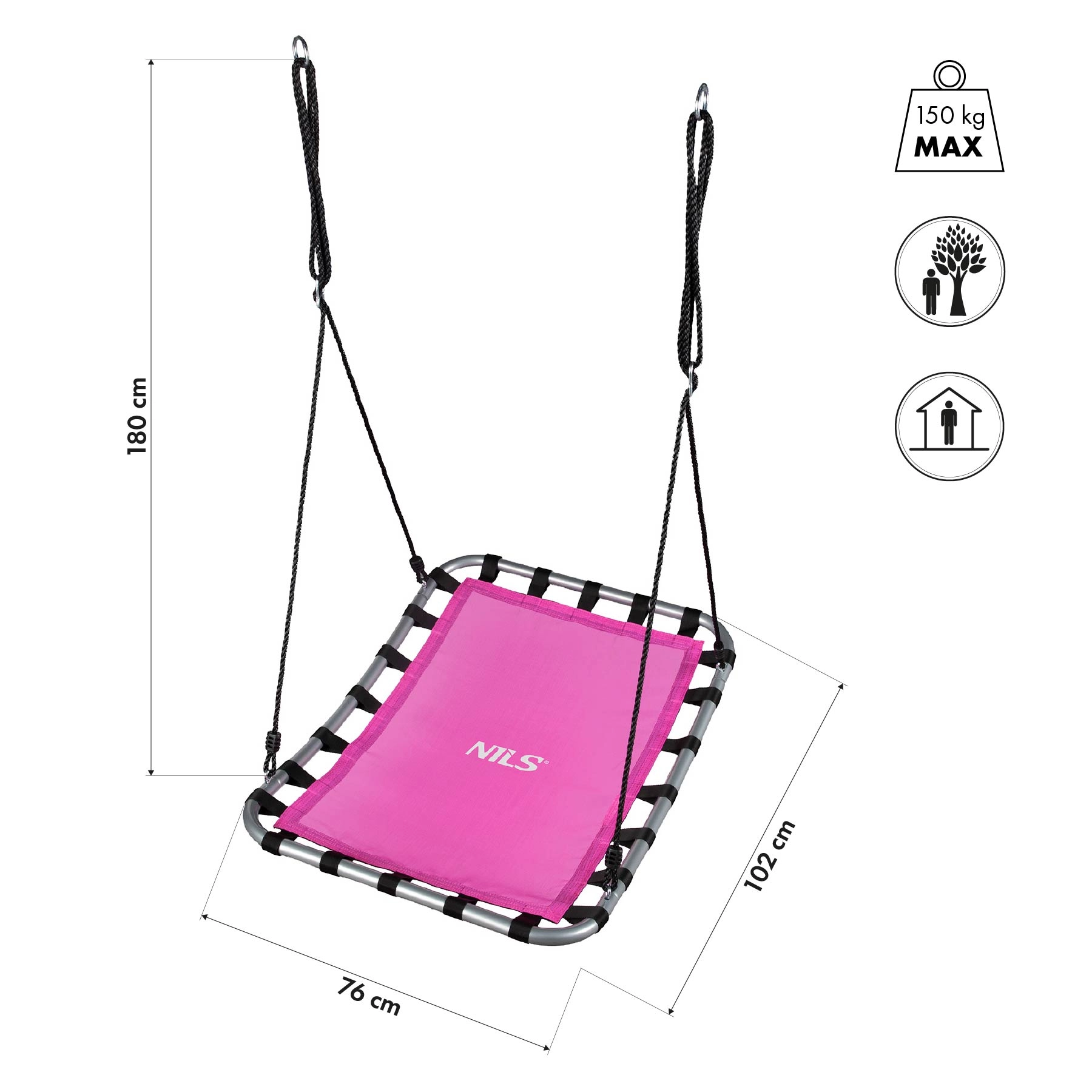 De rechthoekige vorm met afmetingen van 102 × 76 cm biedt veel ruimte om te zitten of te liggen, ook voor twee kinderen tegelijk. Het stalen frame met een profiel van 25 × 1,4 mm zorgt voor stabiliteit en een lange levensduur. Verstelbare touwen tot 180 cm maken eenvoudige montage bijna overal mogelijk, zodat je van het comfort kunt genieten, zowel thuis als in de tuin.