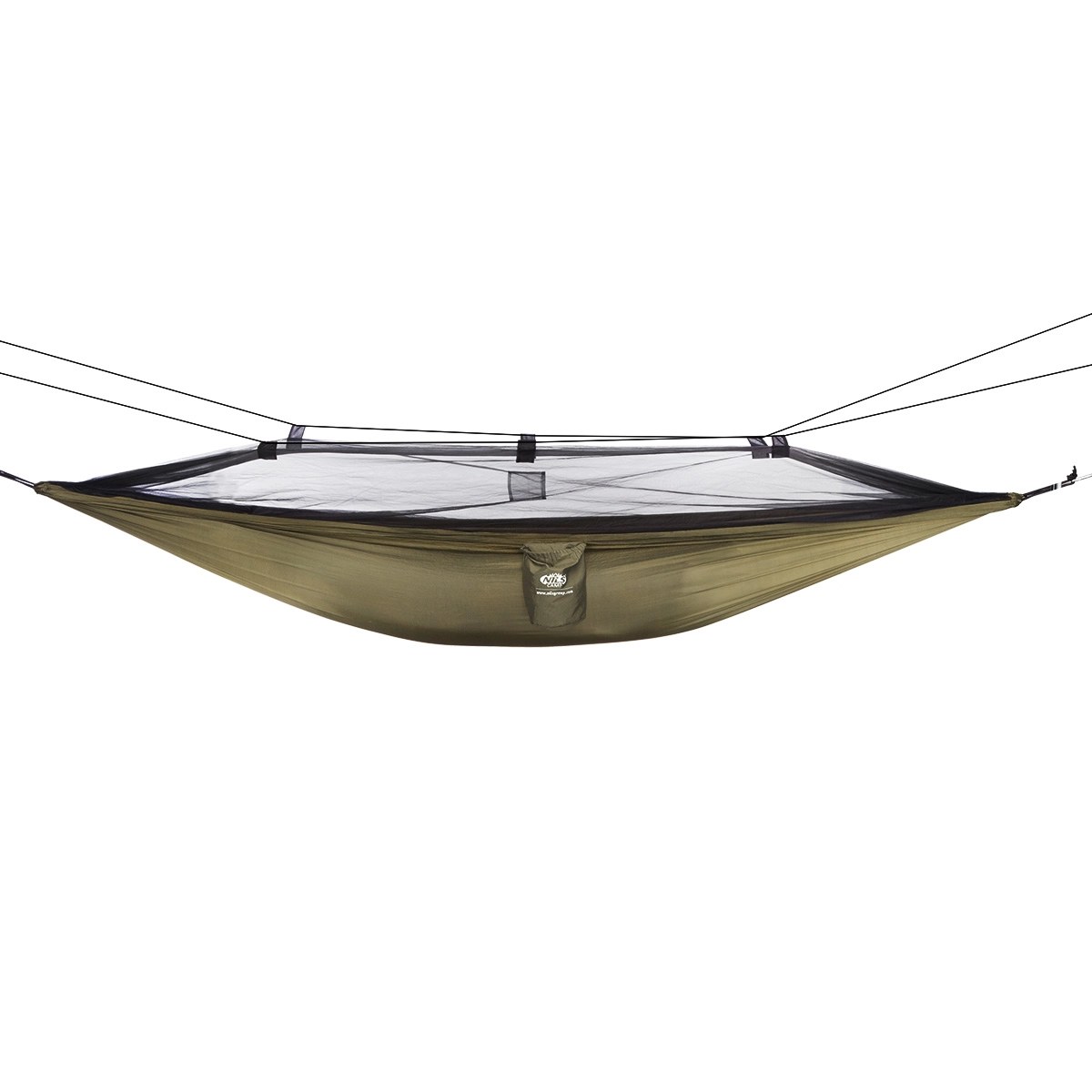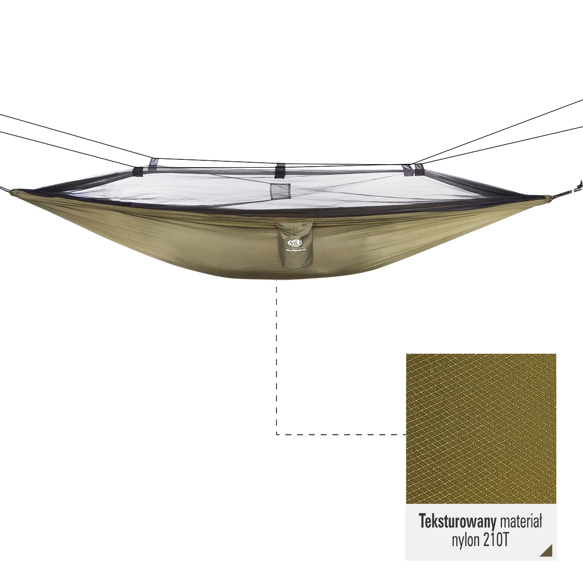 Het sterke en sneldrogende 210T-materiaal met eindlussen, lijnen en karabiners zorgt voor stabiliteit en een draagvermogen tot 180 kg.