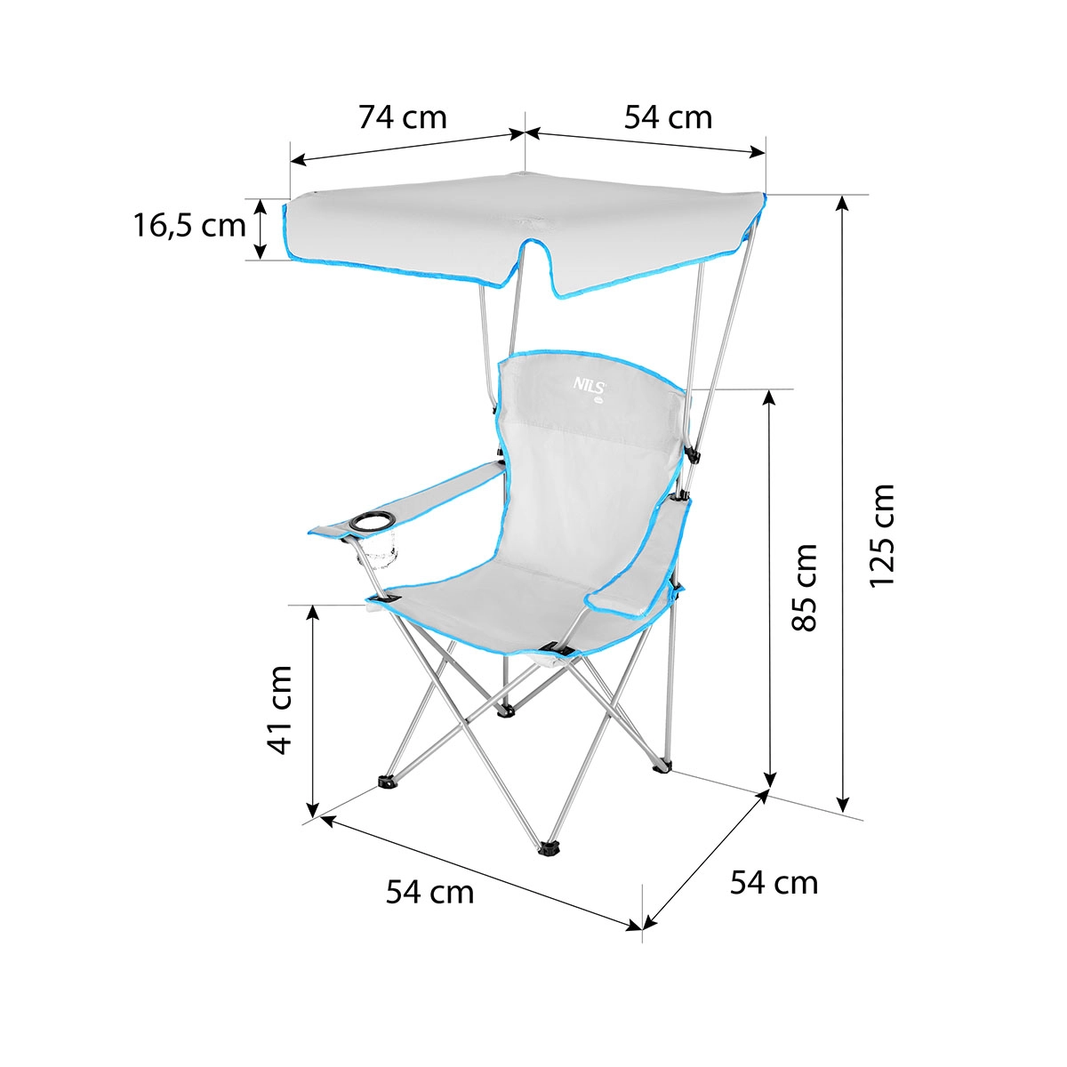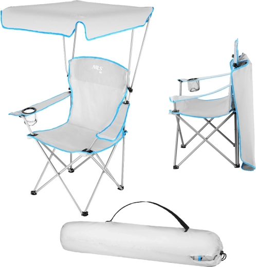 De praktische, opvouwbare campingstoel met zonnescherm van NILS Camp in het grijs is ideaal aan het water, om te vissen, voor festivals en kamperen. Biedt een geïntegreerde inklapbare kap tegen zon en lichte regen, een stabiel stalen frame en een slijtvaste Oxford 600D bekleding. Dankzij verstelbare armleuningen, een bekerhouder en eenvoudig opvouwen is het de perfecte keuze voor comfortabel buiten zitten.