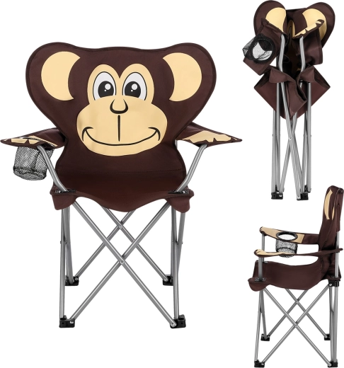 Lichte en stabiele kinder-campingstoel met apenmotief voor uitstapjes naar het water, om te vissen of voor festivals. Biedt een duurzame constructie, draagvermogen van 50 kg, verstelbare armleuningen en een praktische bekerhouder. Dankzij het snel inklappen en de draagtas met schouderriem is hij ideaal voor onderweg.