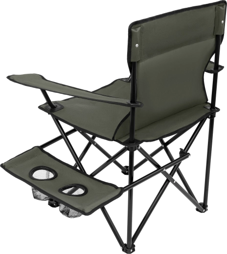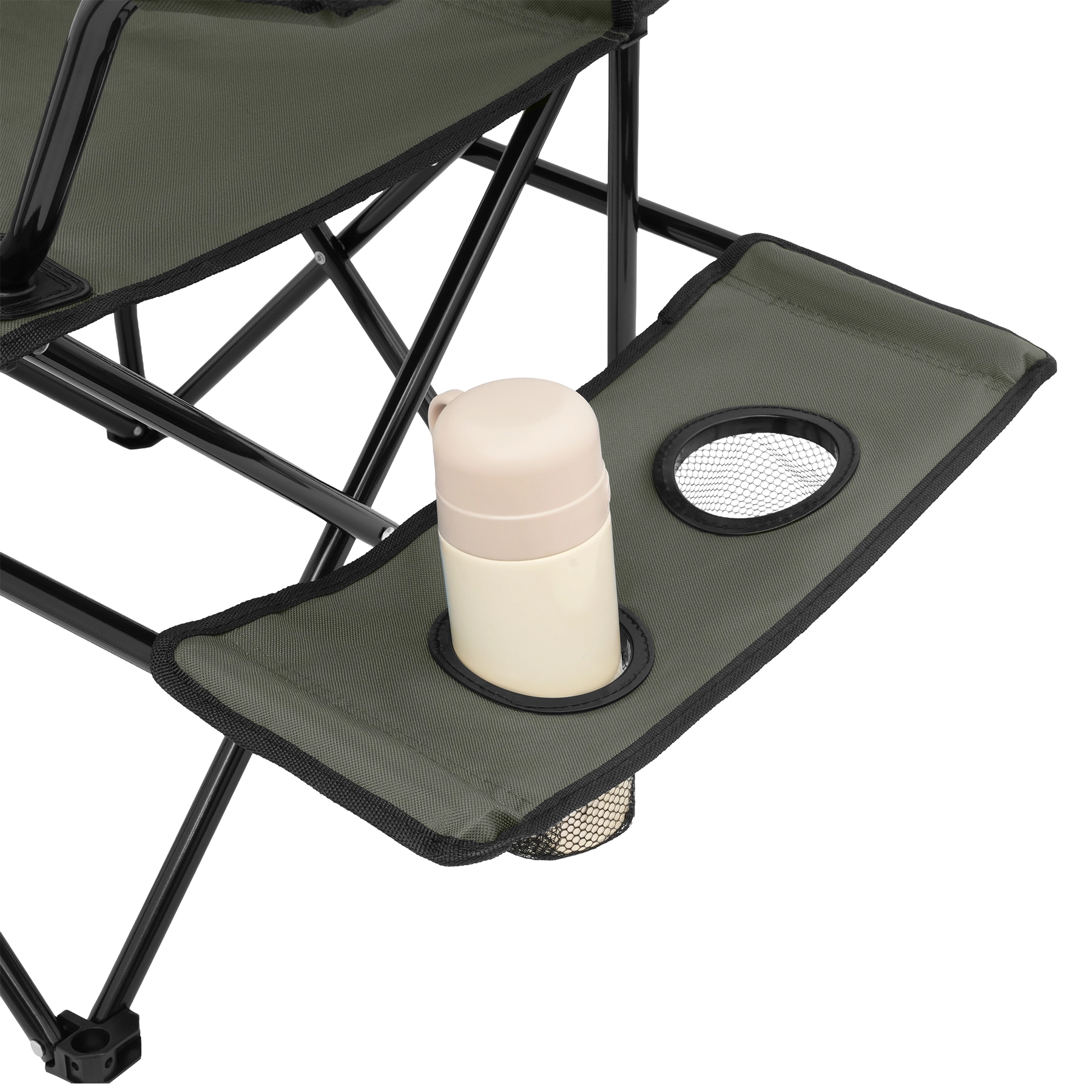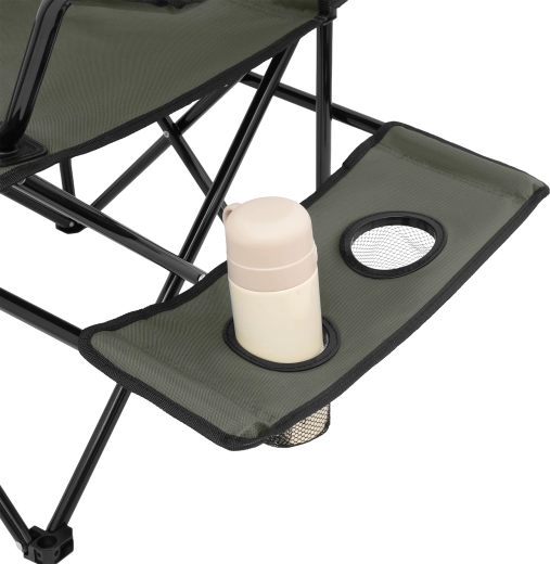 Doordachte details verhogen het comfort tijdens het ontspannen: in de armleuning zit een mesh bekerhouder en aan de zijkant een praktische tafel met nog twee houders, zodat je fles, mok en kleinigheden altijd binnen handbereik zijn. De stoel past ingeklapt in de draagtas met hengsel, die is inbegrepen.