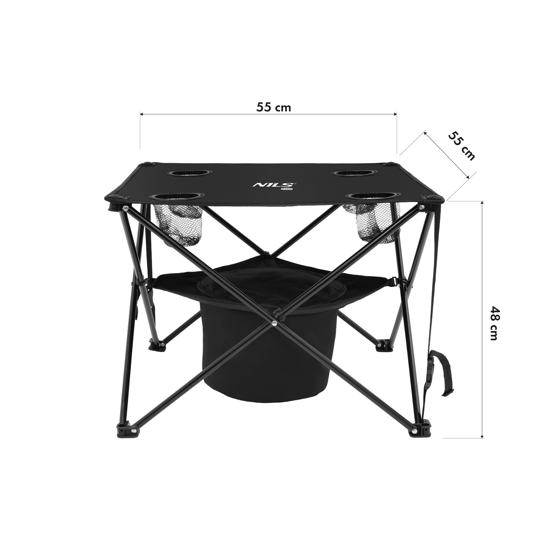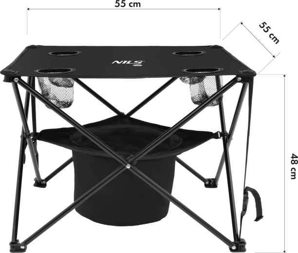 De praktische kampeerset van NILS Camp biedt een opvouwbare tafel en twee comfortabele stoelen voor ontspanning tijdens uitstapjes, picknicks en aan het water. Onder het tafelblad zit een geïntegreerde koeltas voor drankjes en snacks, en op het blad zijn vier houders voor bekers of flessen. Dankzij het stevige stalen frame, de duurzame materialen en de compacte afmetingen na het inklappen is de set stabiel, gemakkelijk te dragen en ideaal voor kamperen.